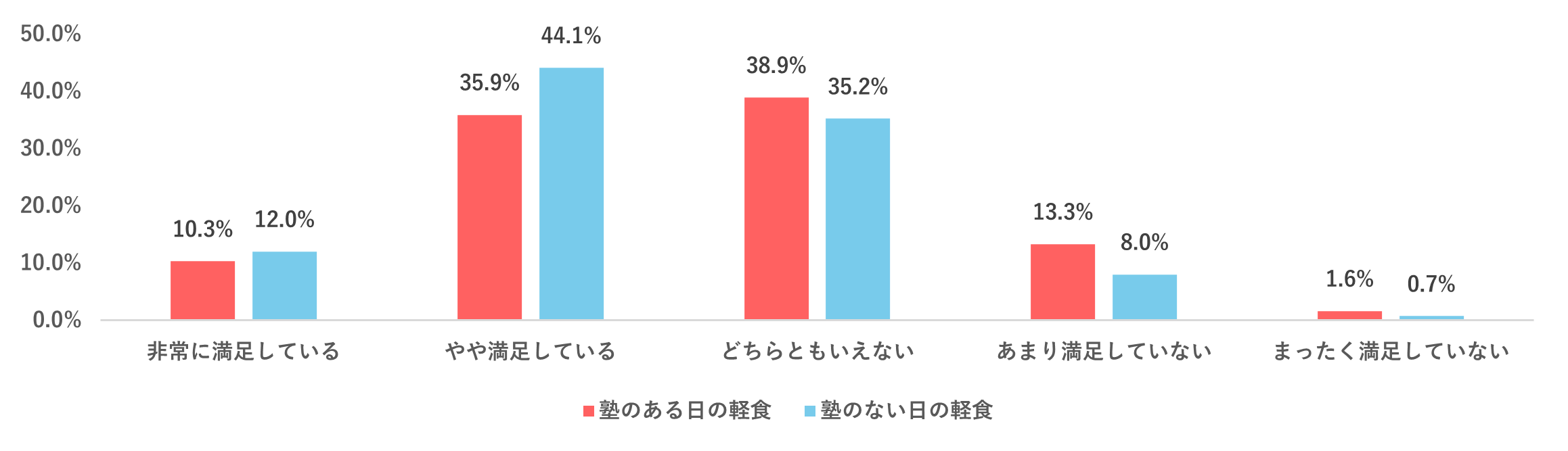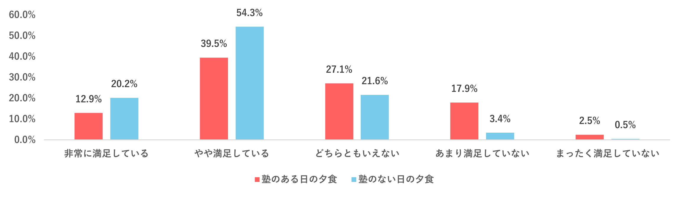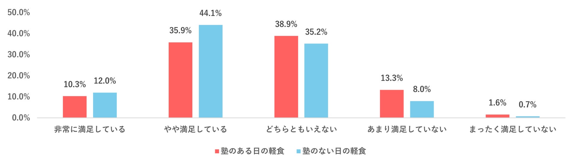 子どもの軽食や夕食に対して、塾がある日とない日でどの程度満足しているか質問したところ、上図の通り、塾がある日は、軽食、夕食ともに比較的保護者の満足度が低いことがわかりました。