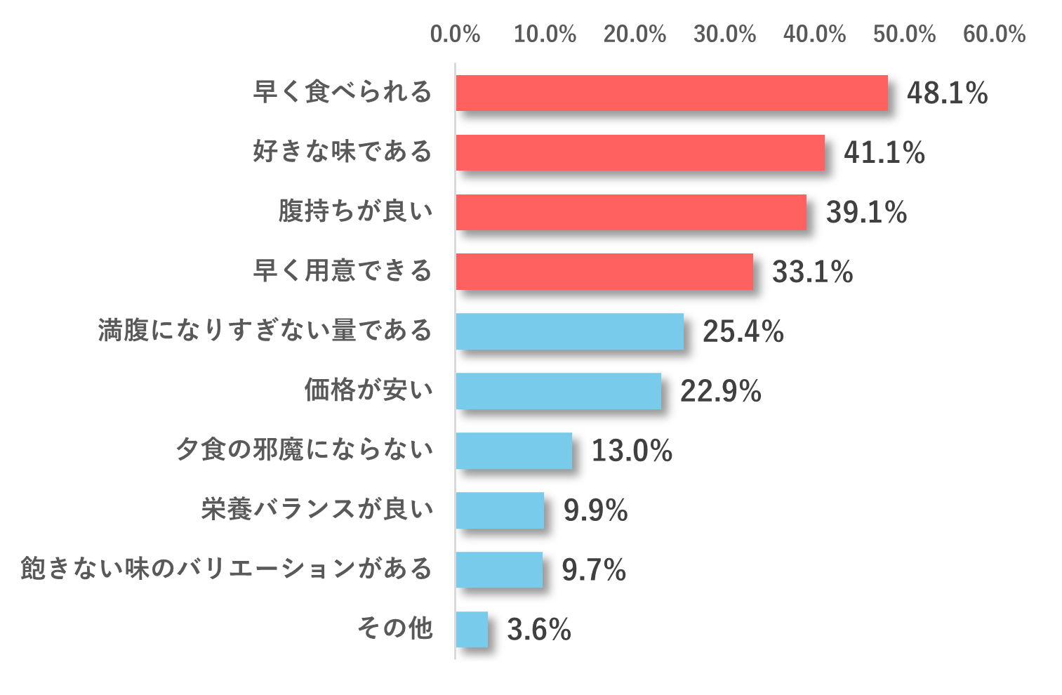 塾前食を食べると回答した414名を対象に、塾前食を選ぶ際に重要視すること、また、親にお願いすることを質問したところ、最多回答は「早く食べられる(48.1%)」、次に「好きな味である(41.1%)」、「腹持ちが良い(39.1%)」、「早く用意できる(33.1%)」と続きました。多くの中学生が塾前食にはタイムパフォーマンスを求めていることがわかりました。