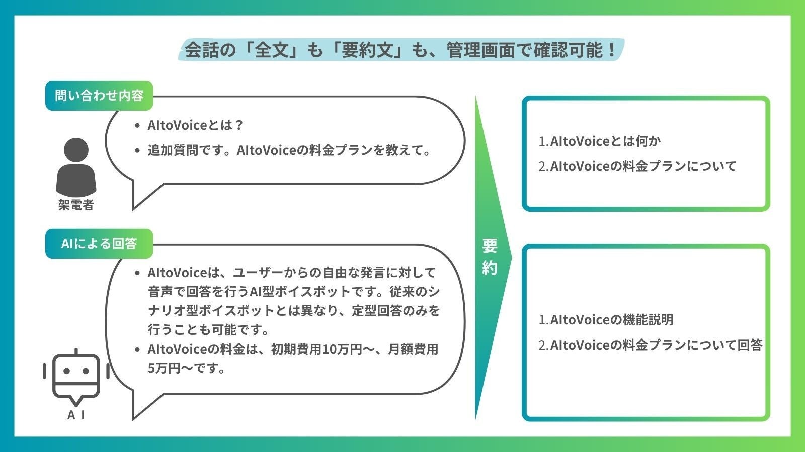 「会話要約」は標準機能となるため、すでに「AItoVoice」を導入いただいている企業様は、現在のプラン内でご利用いただけます。