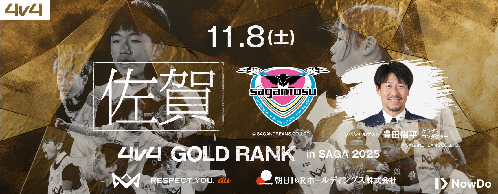 Now Do株式会社(所在地:東京都新宿区、代表取締役社長:本田圭佑)が運営する育成年代向け4人制サッカー大会「4v4」は、ゴールドランク大会「GOLD RANK IN SAGA」を、2025年11月8日(土)に佐賀県嬉野市・嬉野総合運動公園にてにて開催することをお知らせいたします。本大会は、2025年シーズンより「一発逆転の大会」として、優勝チームのみが全国大会「JAPAN CUP」への出場権を獲得できる特別な大会です。