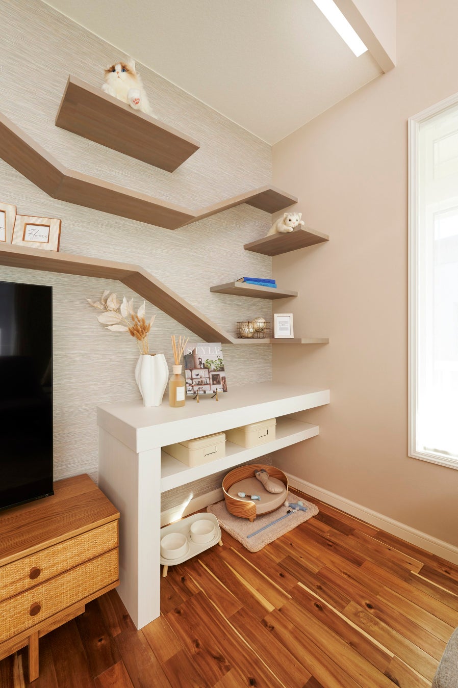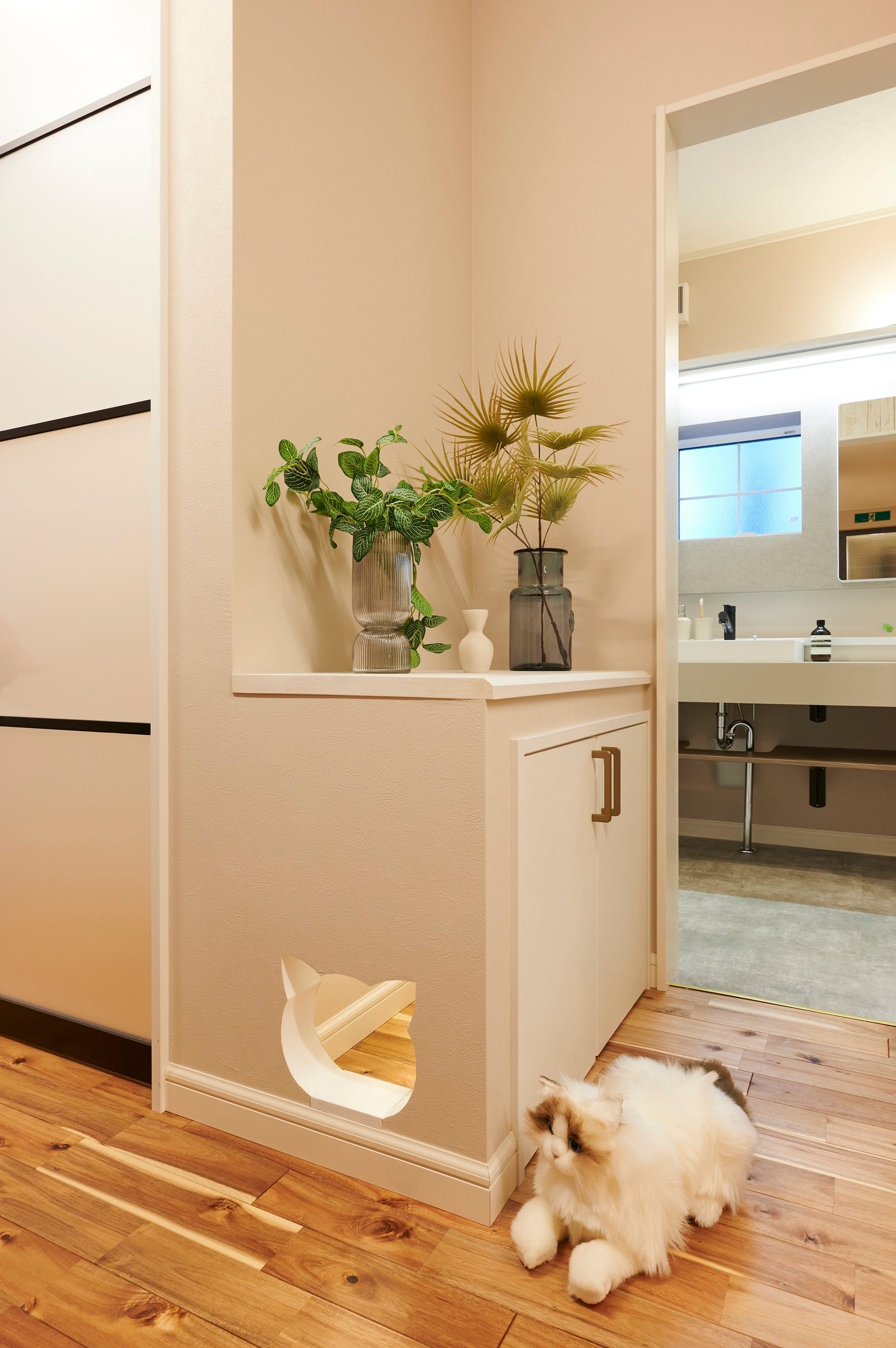 室内は、吹き抜けのある開放的なリビング、天然木の無垢フロアに加え、お風呂⇔洗面・脱衣⇔洗濯・収納⇔室内干しのスペースが一直線に並んだ使い勝手の良い家事ラク動線、玄関・キッチン・洗面などに設けた大容量の収納スペース、家族の服をまとめて収納できるファミリークローゼットなど、家事も楽しく快適にこなせる提案も採用しています。さらに、ペット=愛猫との同居を想定し、キャットウォークや猫用の窓、専用トイレスペースなど、家族の一員である愛猫も快適に暮らせる仕様となっています。