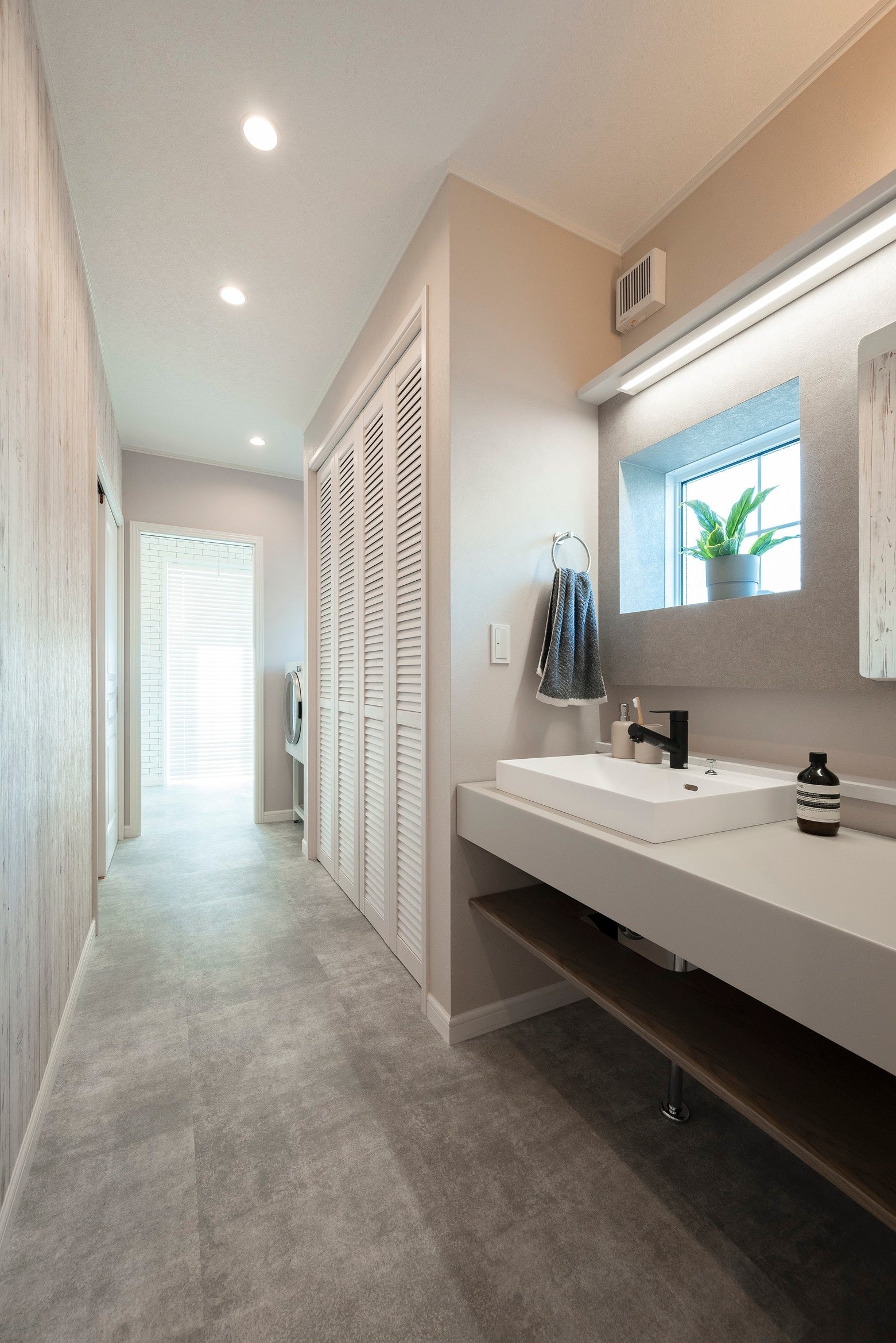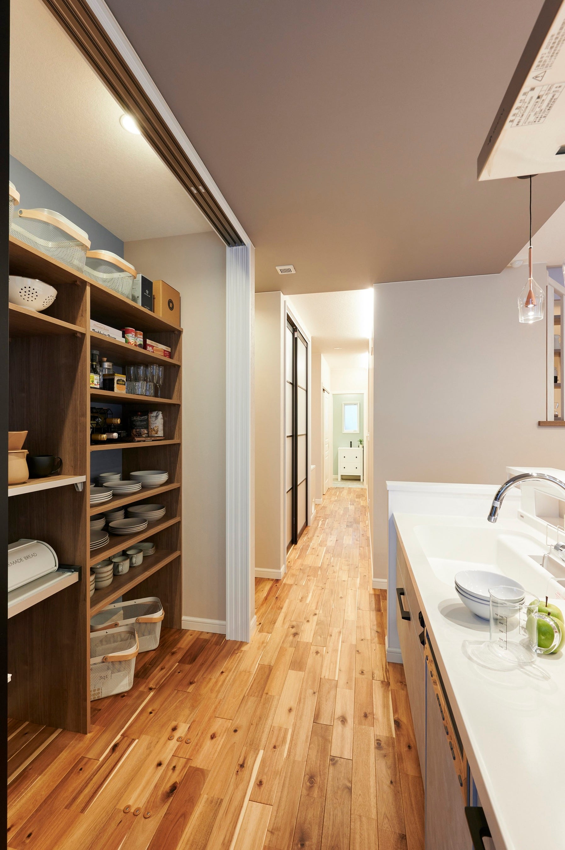 お風呂⇔洗面・脱衣⇔洗濯・収納⇔室内干しのスペースが一直線に並んだ使い勝手の良い家事ラク動線に加え、キッチン後ろや横に大容量のパントリー、玄関には靴だけでなく、ベビーカー、外遊びの道具、外出用のコートなどをしまっておけるアウトドアクローゼットを用意しています。さらに、2階には家族の服をまとめてしまえる「ファミリークローゼット」など、家族みんなが快適に家事をこなせる家事ラク仕様となっています。
