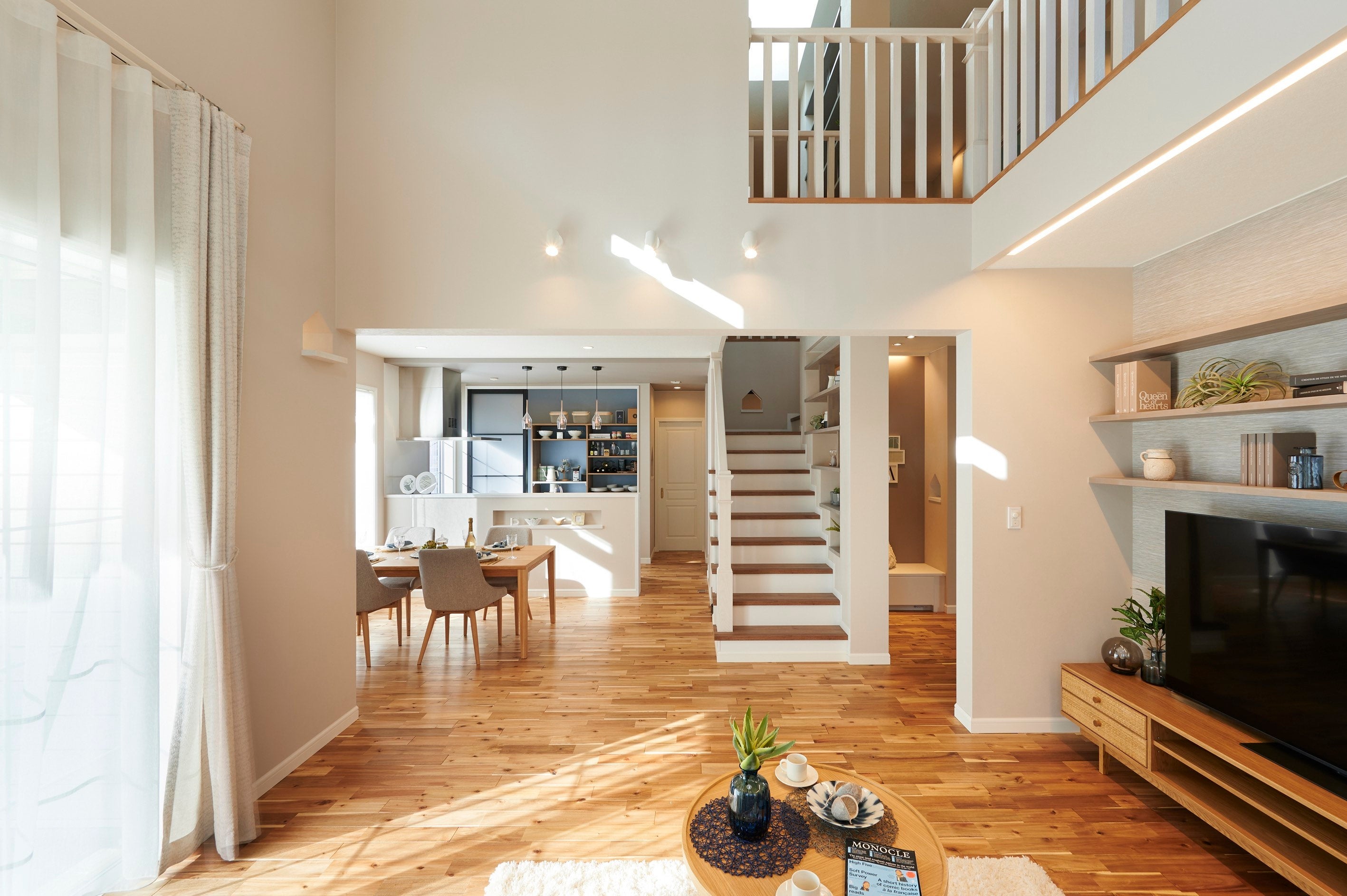 建物は、ツーバイフォー工法の約1.6倍厚のツーバイシックス工法の高耐震に加え、繰り返し地震にも効果を発揮する制震システムを採用したハイパーモノコック構法となっています。また、家全体(床・壁・天井)に高性能断熱材を充填し、ZEH基準相当の断熱性能を確保するとともに、第一種熱交換換気システムを採用していることで、大きな吹き抜けを設けても、快適な温熱環境の空間を実現しています。