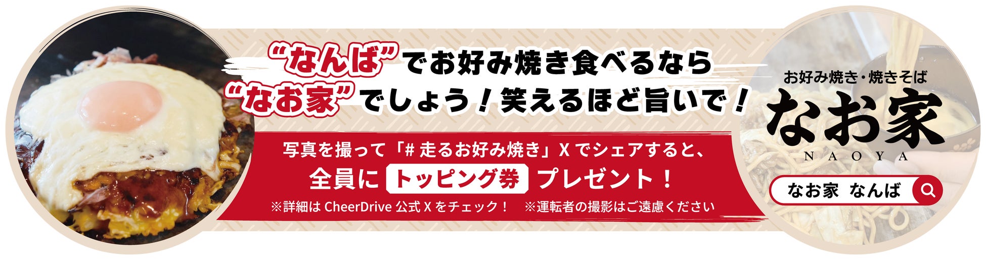 株式会社チアドライブ(本社:東京都中央区、代表取締役社⻑:保科昌孝、 http://cheerdrive.jp/ )が運営する、⼀般ドライバーが愛⾞に好きなブランドやコンテンツのステッカーを貼って⾛⾏することでお礼として⾛⾏距離に応じたスポンサー収⼊が得られるマイカー広告サービス「CheerDrive(チアドライブ)」は、『お好み焼き・焼きそば「なお家 なんば店」OPEN記念!ドライブPRキャンペーン』の受付を2025年3月21日(金)より開始します。