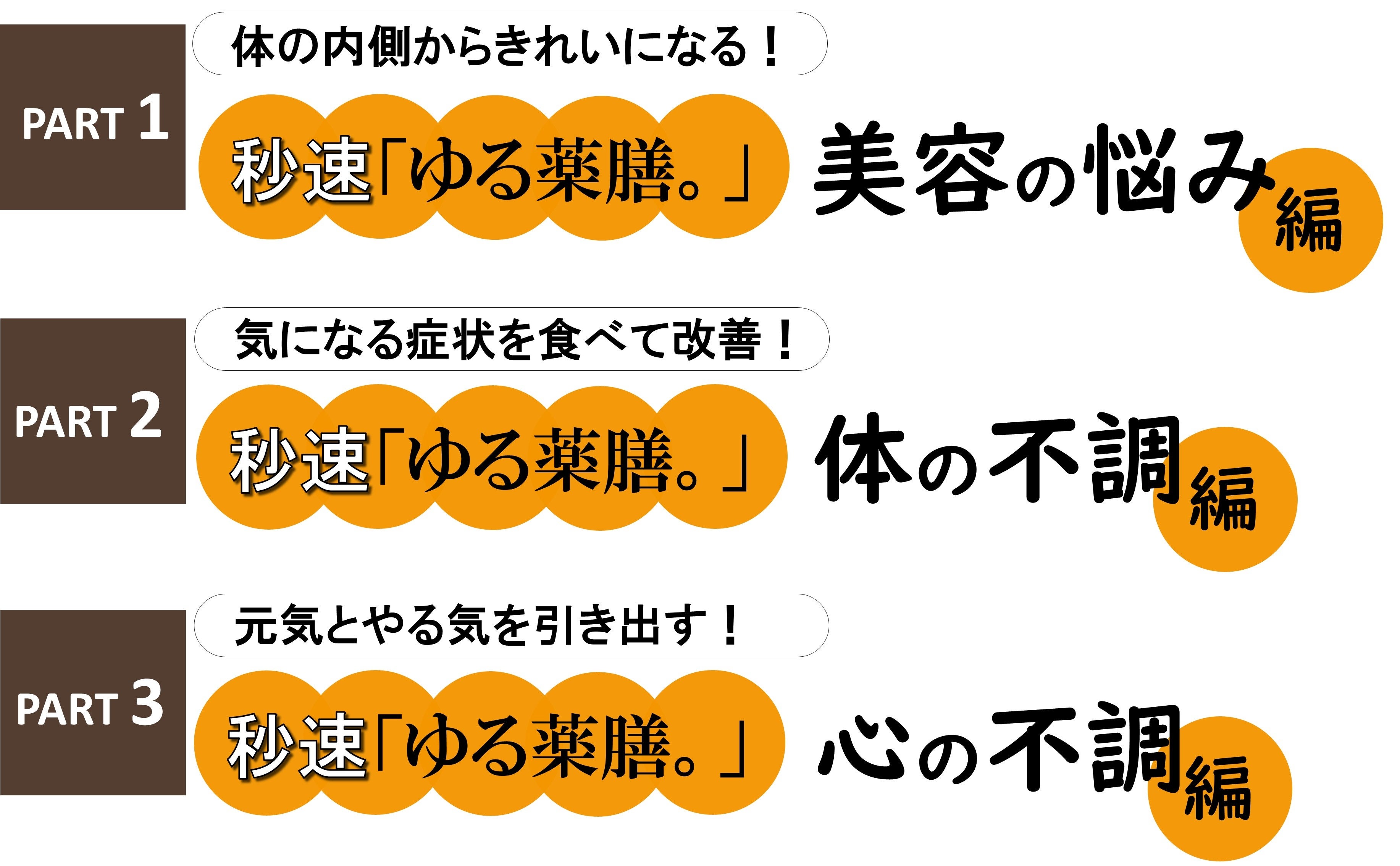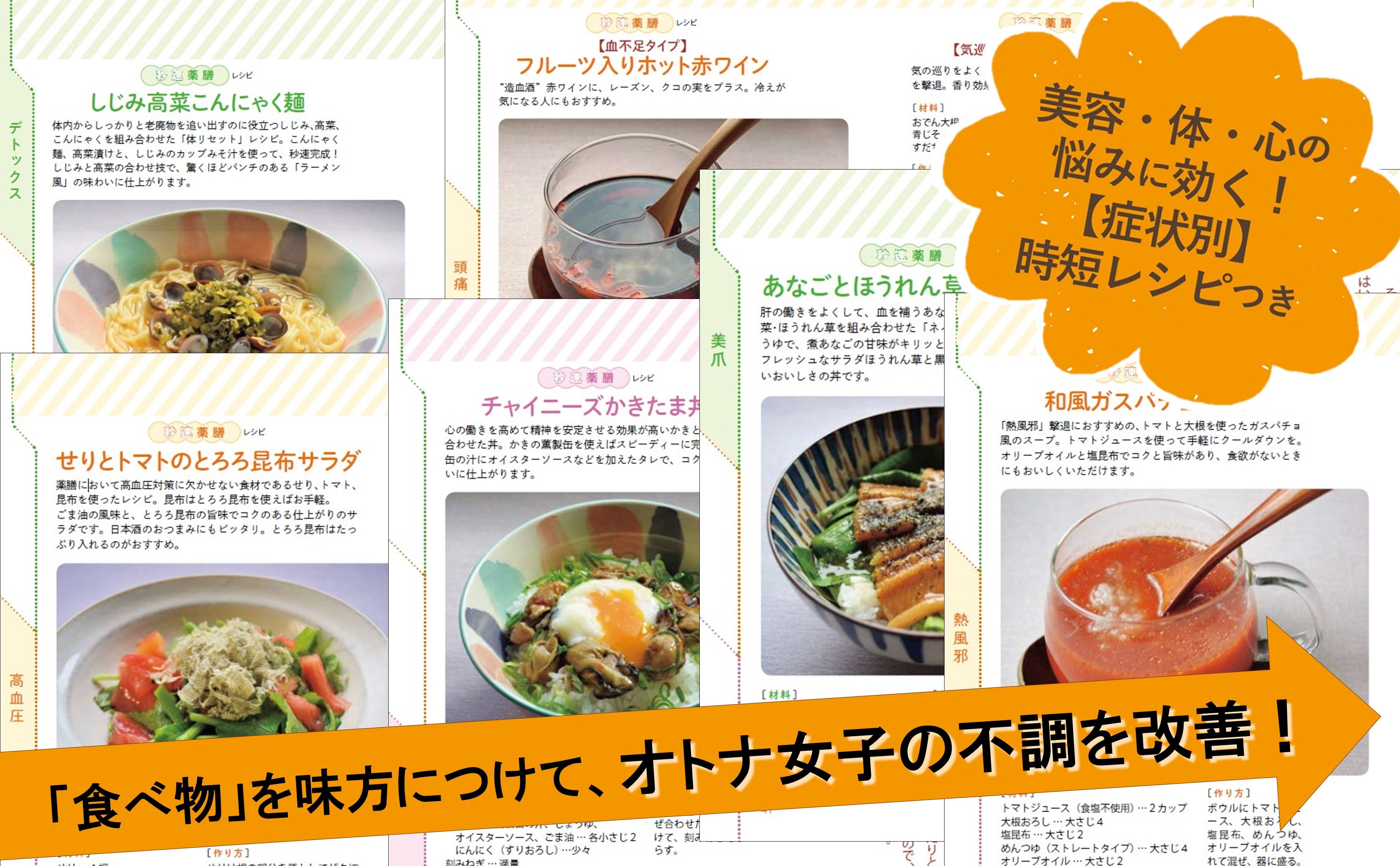 たとえば、”たるみ”をとってリフトアップする食材や、”耳鳴り”や”頭痛”を楽にする食材、”ストレス”に効く「食べるアロマテラピー効果」を発揮する食材などを使った、【症状別】の時短レシピつき。