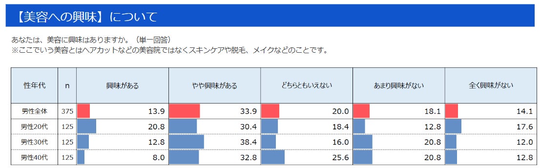美容への興味について聞いた質問では、若い世代ほど「興味がある」の割合が高い結果となりました。「やや興味がある」も含めると、20代・30代男性は半数以上が美容に興味をもっているようです。