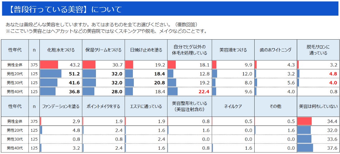 普段行っている美容について複数回答で聞いた質問では、全年代で「化粧水をつける」が最多でした。20代・30代男性は「保湿クリームをつける」「日焼け止めを塗る」と続くのに対し、40代男性は「保湿クリームをつける」「自分でヒゲ以外の体毛を処理している」と続いています。