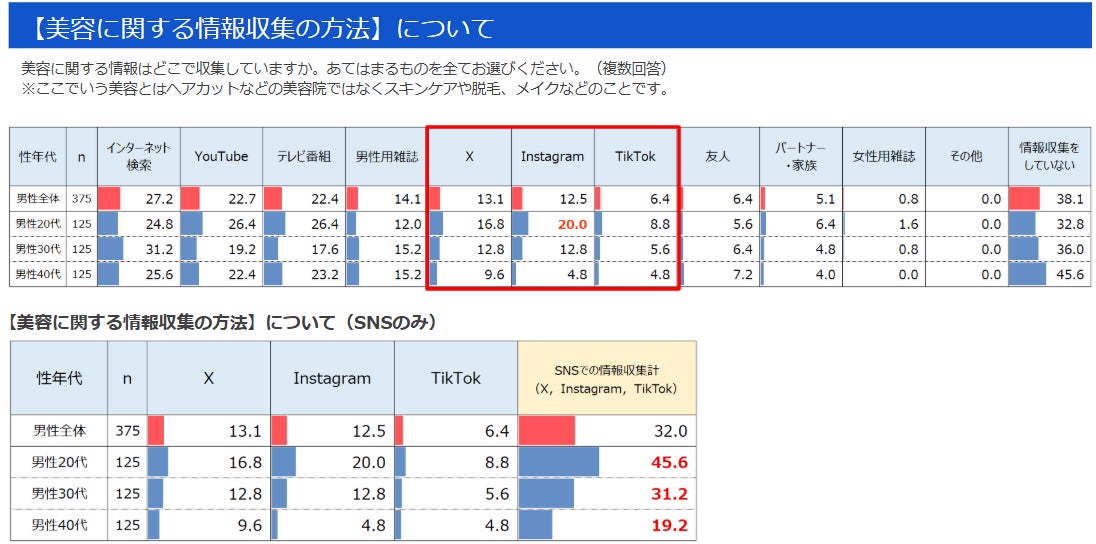 20代~40代男性375名調査で判明 20代男性の美容情報収集先、SNSが50%に迫る Instagramは20%も