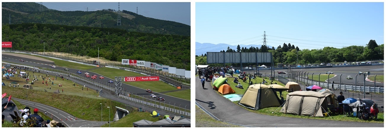 晴天の場合は富士山を見ながらキャンプが可能で、土曜日夜はバーベキューなども楽しめます。テントから観戦 するもよし、拠点にしてグランドスタンド(指定席券必要)やその他エリアで観戦するなど、レース観戦とアウトドアを是非、富士スピードウェイでお楽しみください。