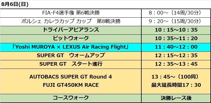 夏休み期間中に開催される今大会は、真夏の過酷な環境下の中で争われる450km(100周)のレースで、シリーズチャンピオン争いを占う上でも重要な一戦となります。また、サーキット場内に宿泊が可能となっており、キャンプや車中泊などサーキットでのアウトドアをお楽しみいただけるほか、空高く舞うエアレース・パイロット、室屋義秀選手のデモンストレーションフライト「Yoshi MUROYA × LEXUS Air Racing Flight」(https://www.fsw.tv/freeinfo/052341.html)は迫力抜群です。息をのむようなフライトを体感しましょう!イベント広場では、各種グルメが楽しめる飲食ブースやSUPER GT 参戦メーカーのPRブース、ドライバー・監督によるトークショーや、2023年に放送予定のアニメ『オーバーテイク!』で声優を務める小西克幸さんを始めとする声優陣が出演するトークショーなど、様々なコンテンツが用意され、真夏のSUPER GT を盛り上げます!