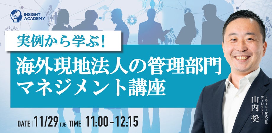 グローバル⼈材育成・研修業を⼿掛けるインサイトアカデミー株式会社(東京都港区、代表取締役:北村嘉章)は、2022年11月29日(火)11時より、無料webセミナー「実例から学ぶ 海外現地法人の管理部門マネジメント講座」を開催します。現在、お申込み受付中!