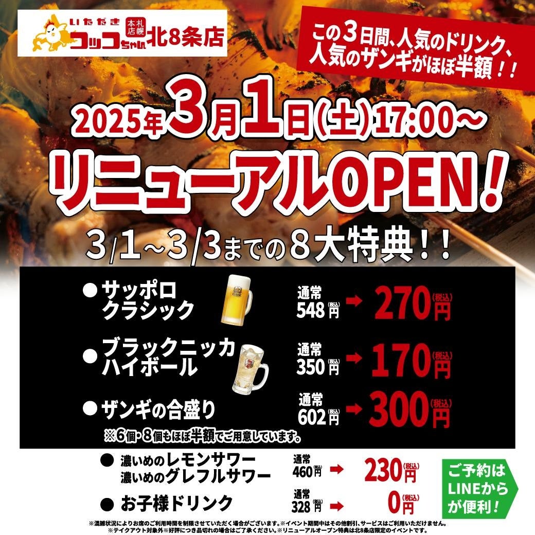 【3月1日(土)17:00リニューアルオープン!】北海道ご当地焼鳥を楽しめる『いただきコッコちゃん北8条店』がリニューアル記念の人気商品ほぼ半額祭りを3日間限定で開催!お子さまドリンク0円も!