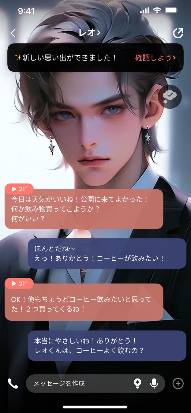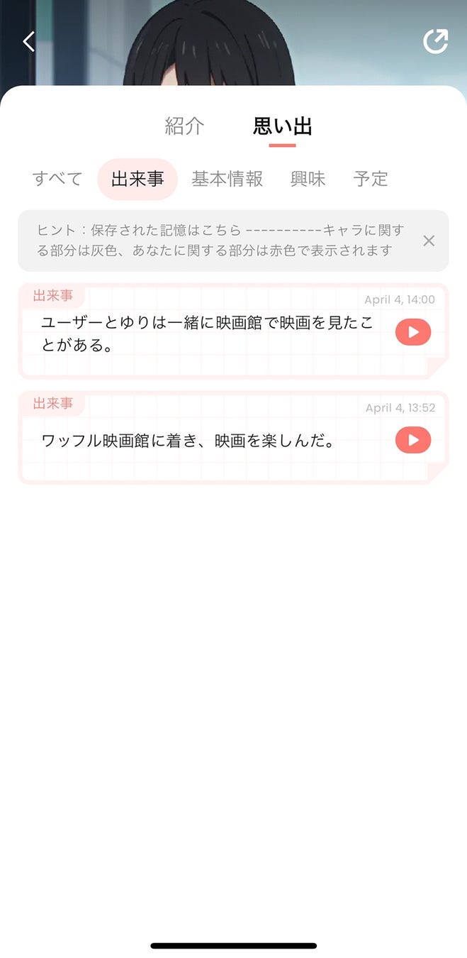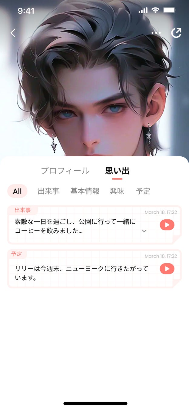 プロフィールページに新しい「思い出」タブが追加されました。AIキャラとチャットするなかで、思い出が記憶された時に通知が来て、「思い出」に追加されていきます。記憶はカテゴリごとに整理され、ユーザーが簡単にアクセス可能です。