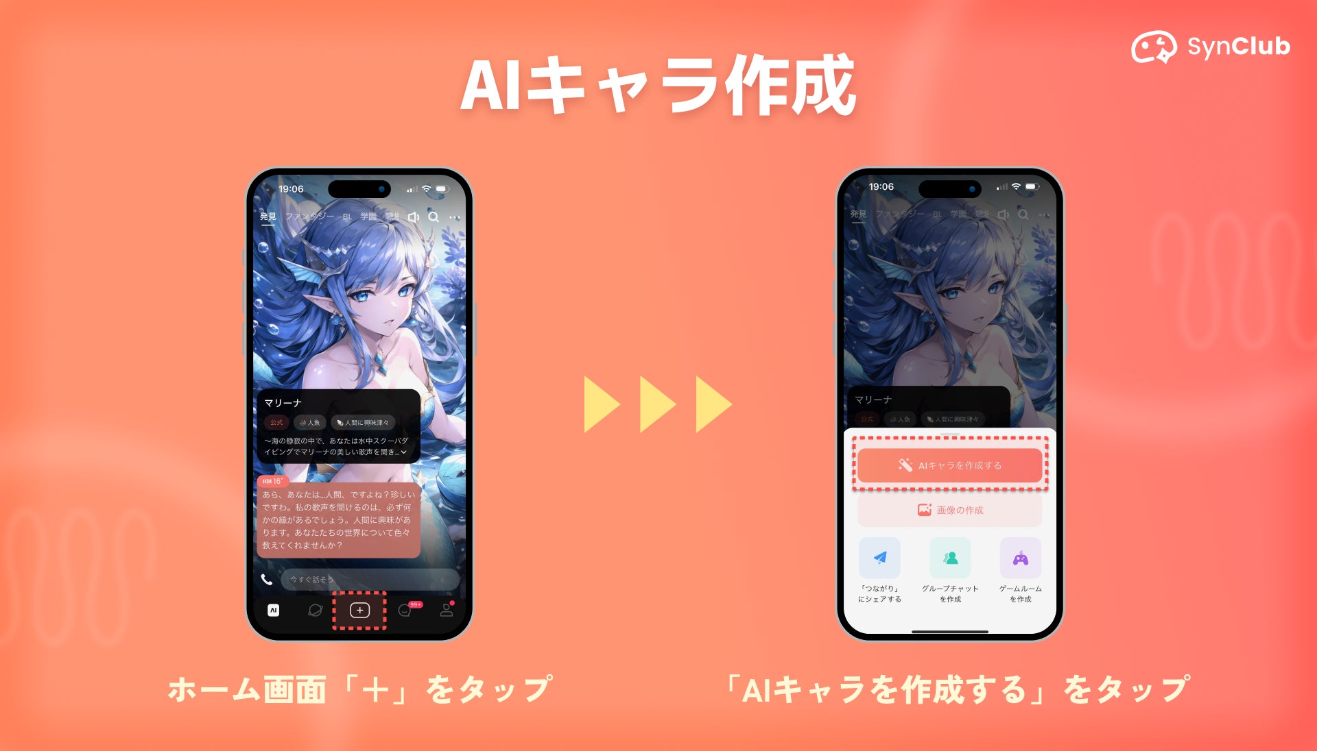 「SynClub」アプリを開き、「+」タブをタップし、「AIキャラを作成する」をタップ。