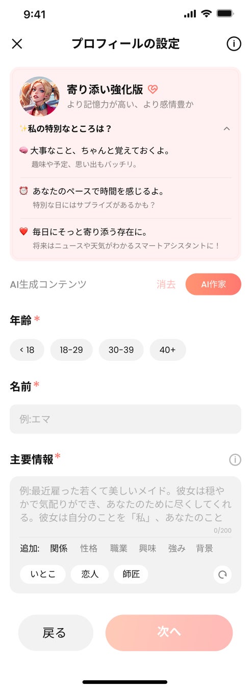 今までは、年齢と名前を入力し、キャラクターの説明欄にテキスト入力で設定を記入できる仕様でしたが、今回のアップデートで項目ごとに記載が可能になりました。