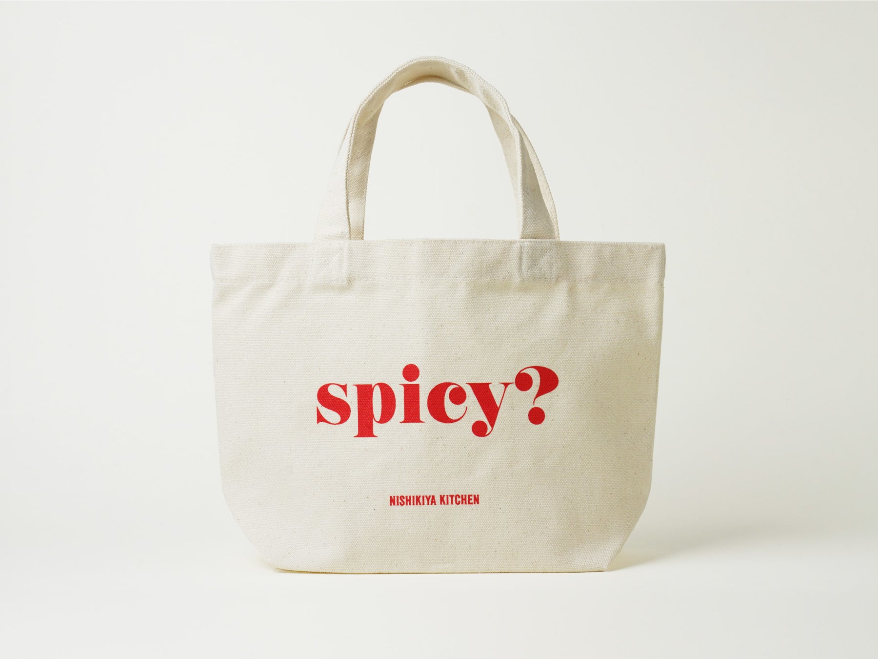 ニシキヤキッチンオリジナルの数量限定品で、鮮やかな⾚の⾊味がアクセントとなる、「Spicy?」の文字がデザインされた、シンプルでユーモアのあるランチバッグです。