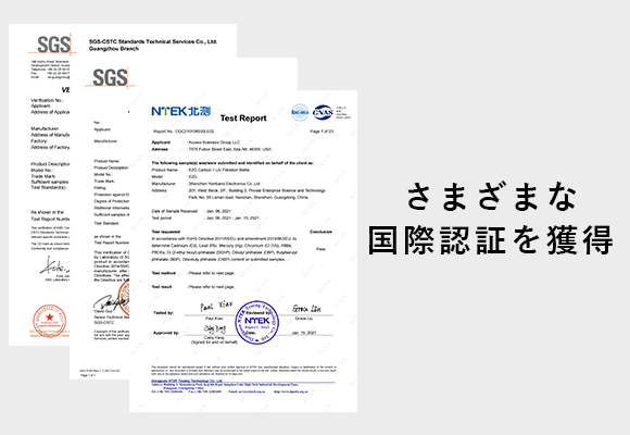 安心してお使いいただけるよう、除菌効果の適格性を証明するために、さまざまな必要な検査を行い、認証を取得しております。
