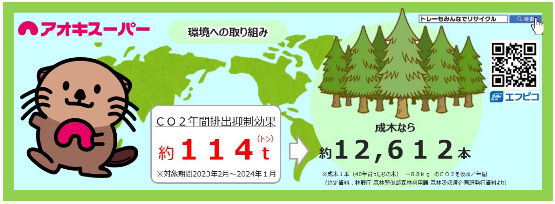 アオキスーパーにおける使用済み食品トレー容器の、2023年度回収量は57.8tとなり、それを資源として再生された「エコトレー」「エコAPET」「エコOPET」製品をお肉やお魚、お惣菜、寿司容器などに幅広く使用し、114t(トン)のCO2排出量を抑制できました。