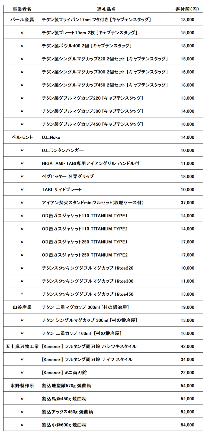 アウトドアのまち宣言を行った新潟県三条市(市長:滝沢 亮)は、アウトドア・キャンプ用品32品目を新規返礼品として採用し、寄付受付を開始しました。