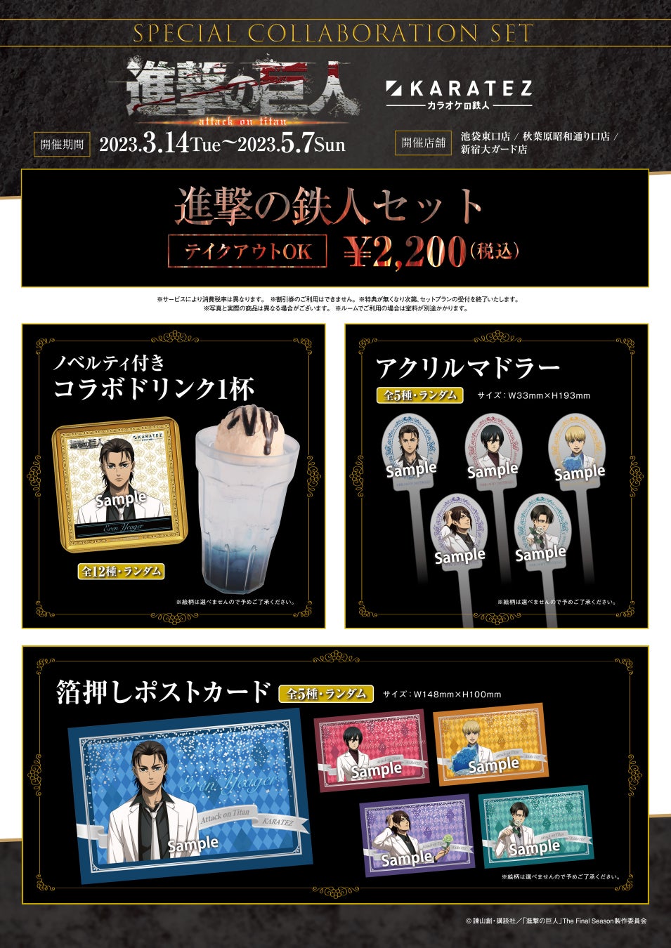 池袋東口店、秋葉原昭和通り口店、新宿大ガード店では、コラボドリンクとセットメニュー限定のノベルティが付いた「進撃の鉄人セット」を2,200円(税込)[テイクアウトの場合2,160円(税込)]で販売します。