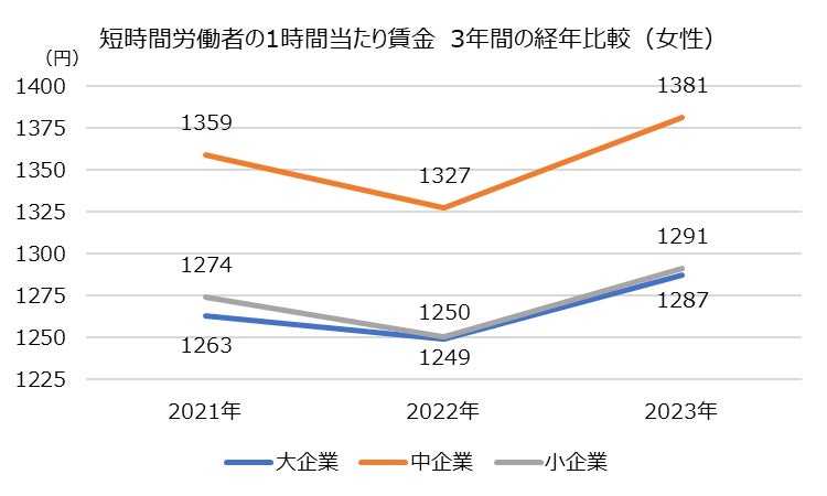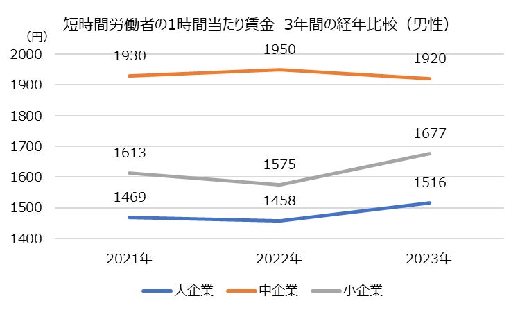 短時間労働者の1時間当たり賃金について、3年間の経年比較を実施したところ、2022年調査同様、2023年時点においても、中企業、小企業、大企業の順に賃金が高くなっていることが分かりました。