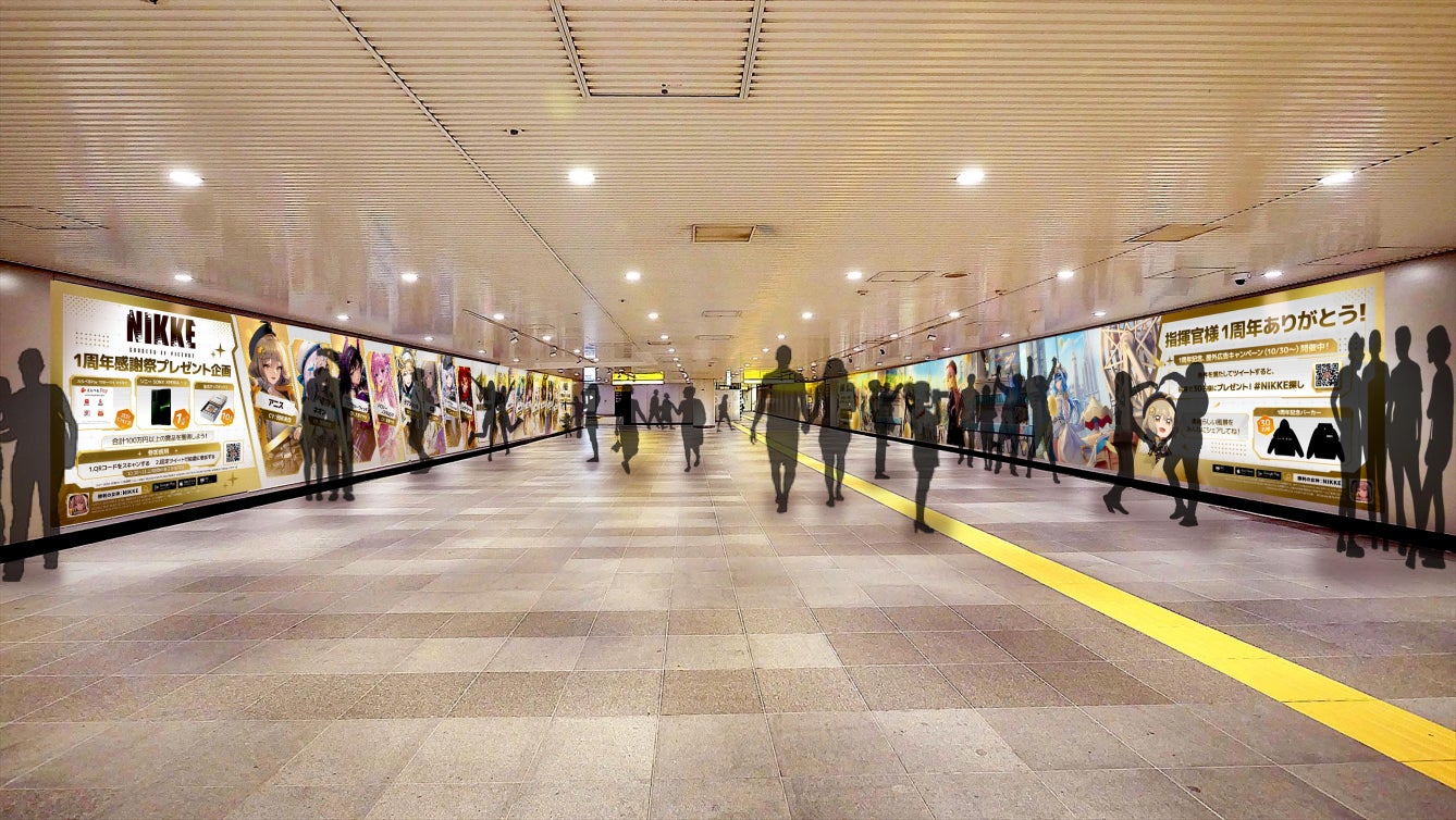 ▽1周年記念イベント②:「勝利の女神:NIKKE」の渋谷109方面へ向かう地下通路にピールオフ広告を展開