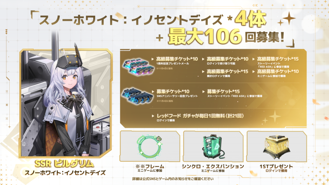 ⚫️ 豪華1stアニバーサリー特典!イベント参加で106回募集&新ニケ「スノーホワイト:イノセントディズ」4体が無料獲得できる!
