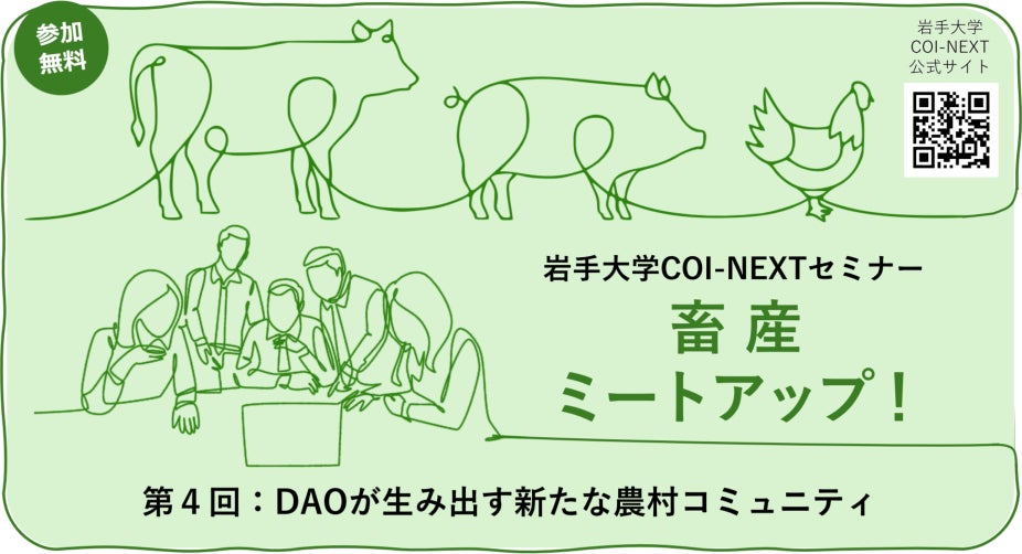 株式会社農情人(本社:千葉県船橋市、代表取締役社長:甲斐雄一郎)は、岩手大学が科学技術振興機構(JST)の「共創の場形成支援プログラム(COI-NEXT)」の支援を受けて開催する「岩手大学COI-NEXTセミナー 畜産ミートアップ!第4回:DAOが生み出す新たな農村コミュニティ」において、代表の甲斐雄一郎が講師として登壇することをお知らせいたします。