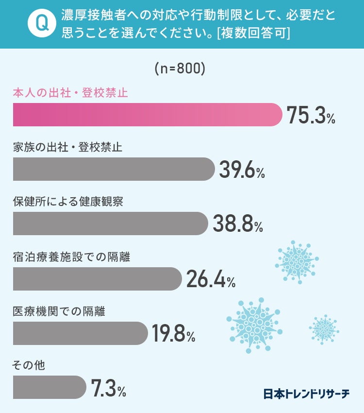 濃厚接触者への対応や行動制限としては、75.3%の方が「本人の出社・登校禁止」、39.6%の方は「家族の出社・登校禁止」も必要だと感じているようです。