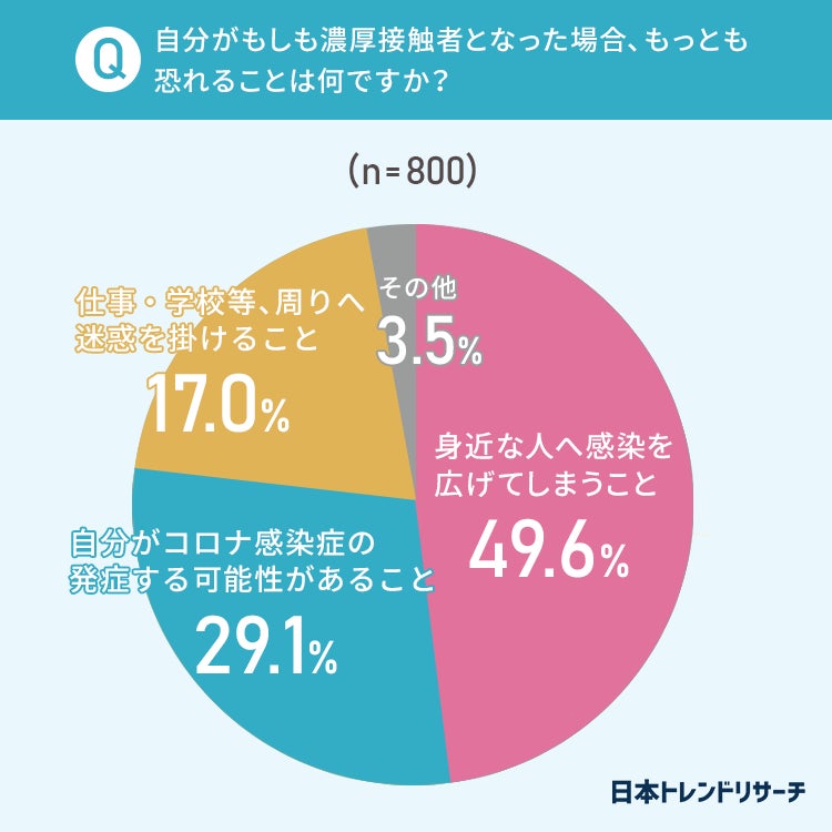 また、約半数の方は、もしも自分が濃厚接触者になった場合に、最も怖いのは「身近な人へ感染を広げてしまうこと」と回答しました。