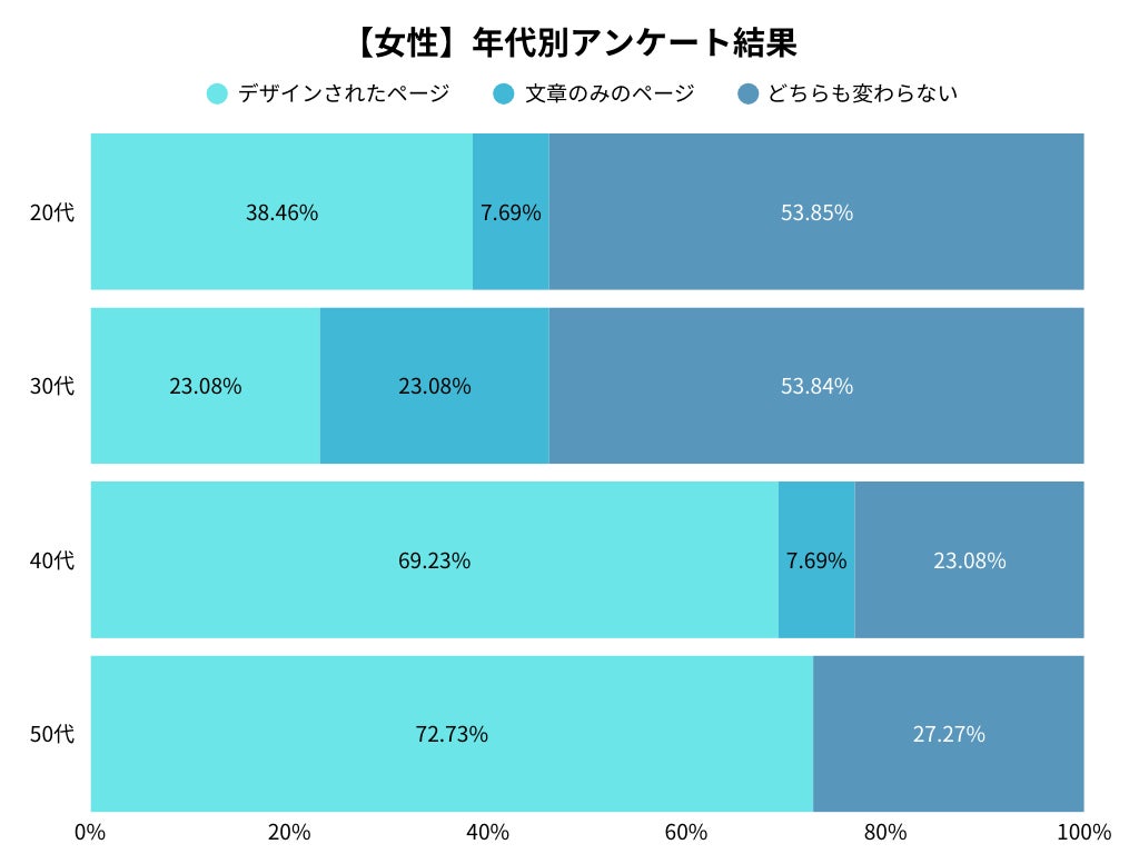 対して女性は23.08%が「デザインされたページ」、23.08%が「文章のみ」と分かれ、内容そのものに着目する傾向が際立ちました。