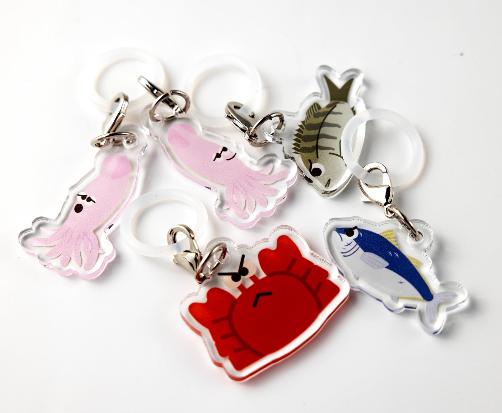 傘やペットボトルなどにつけて、持ち物の目印に。能登の海産物&お祭りの絵柄を販売しています。
