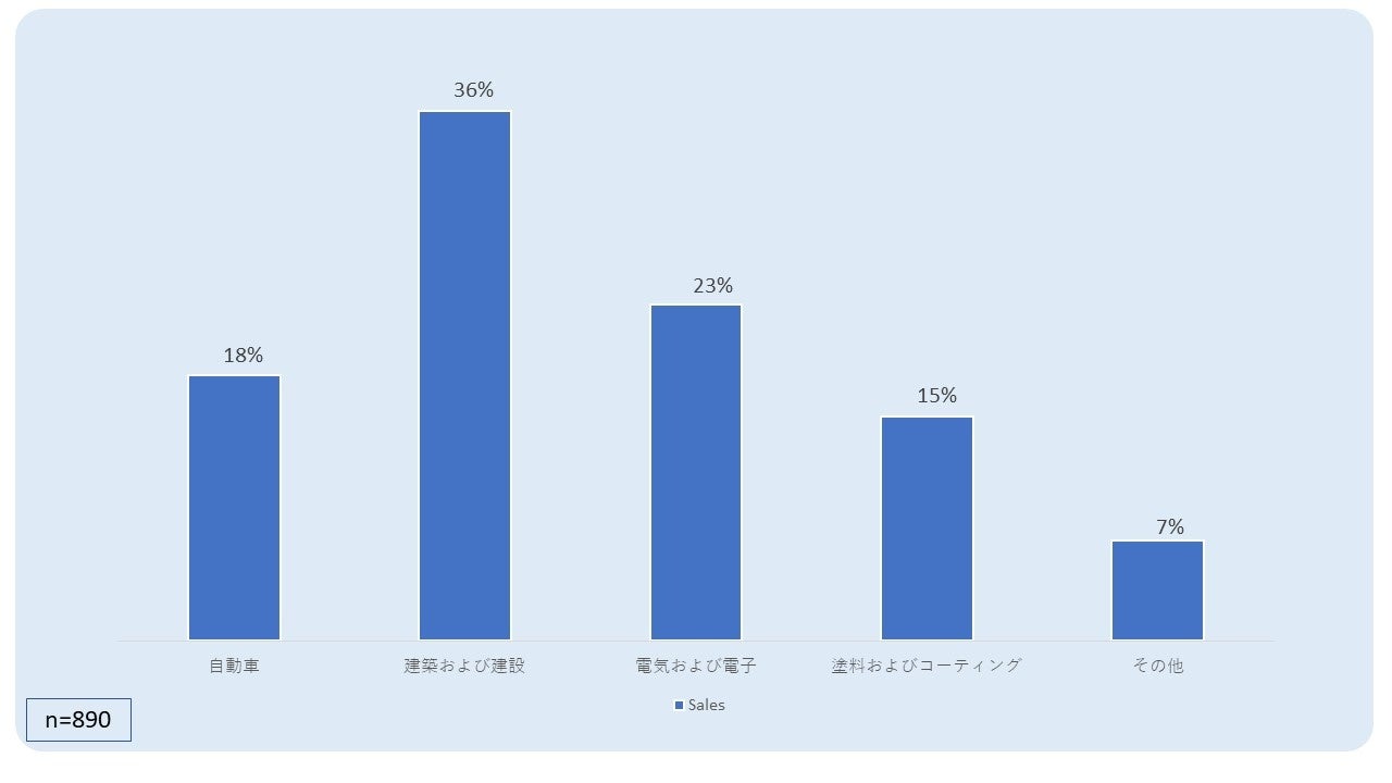 - インドユーザー産業に関しては、建築および建設部門がメタクリレートモノマーの主な消費者として浮上しており、回答者の 36.4% がこれらの材料を主に建設関連用途に利用しています。 電気および電子機器が市場の 23.1% を占め、次いで自動車が 18.2% でした。 塗料およびコーティングは回答の 15.4% を占めて、その他の産業は 6.9% を占めました。