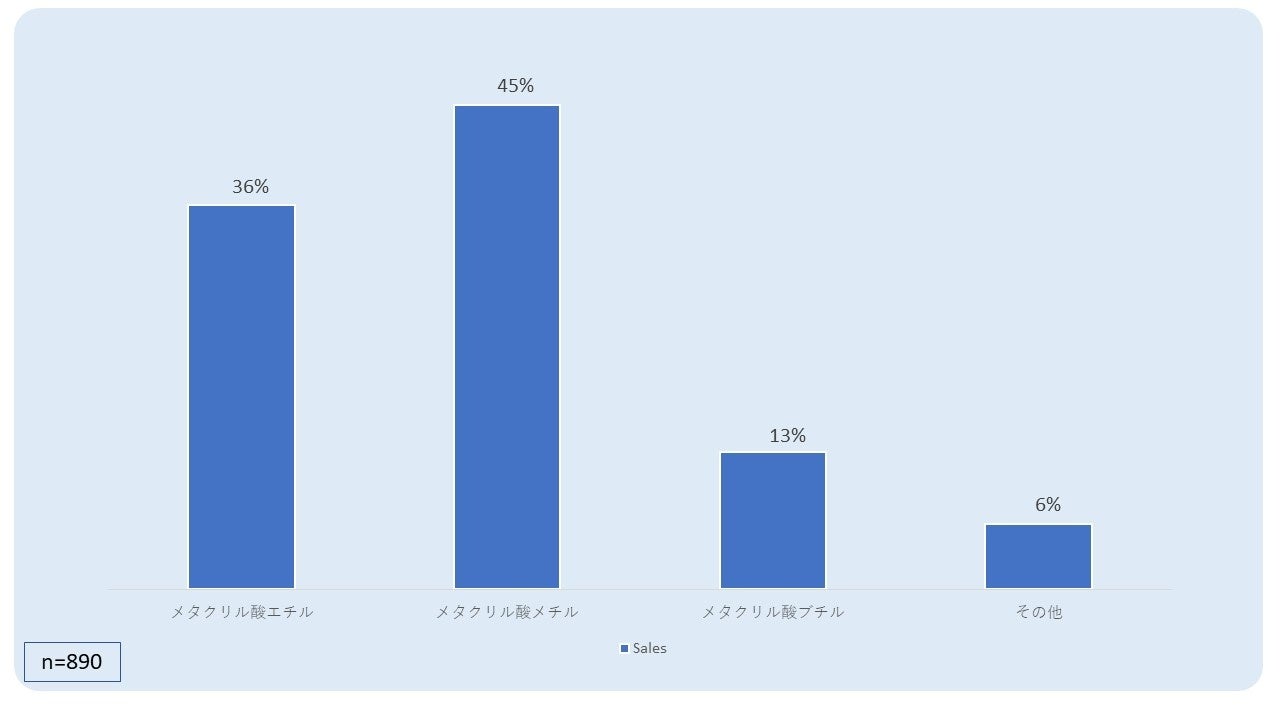 - 調査結果によると、誘導体の選択肢の中で、メタクリル酸メチルが最も一般的に製造または利用されており、回答の 45.2% を占めています。 メタクリル酸エチルが市場の 35.9% を占めて、メタクリル酸ブチルとその他の誘導体がそれぞれ回答の 12.8% と 6.1% を占めました。