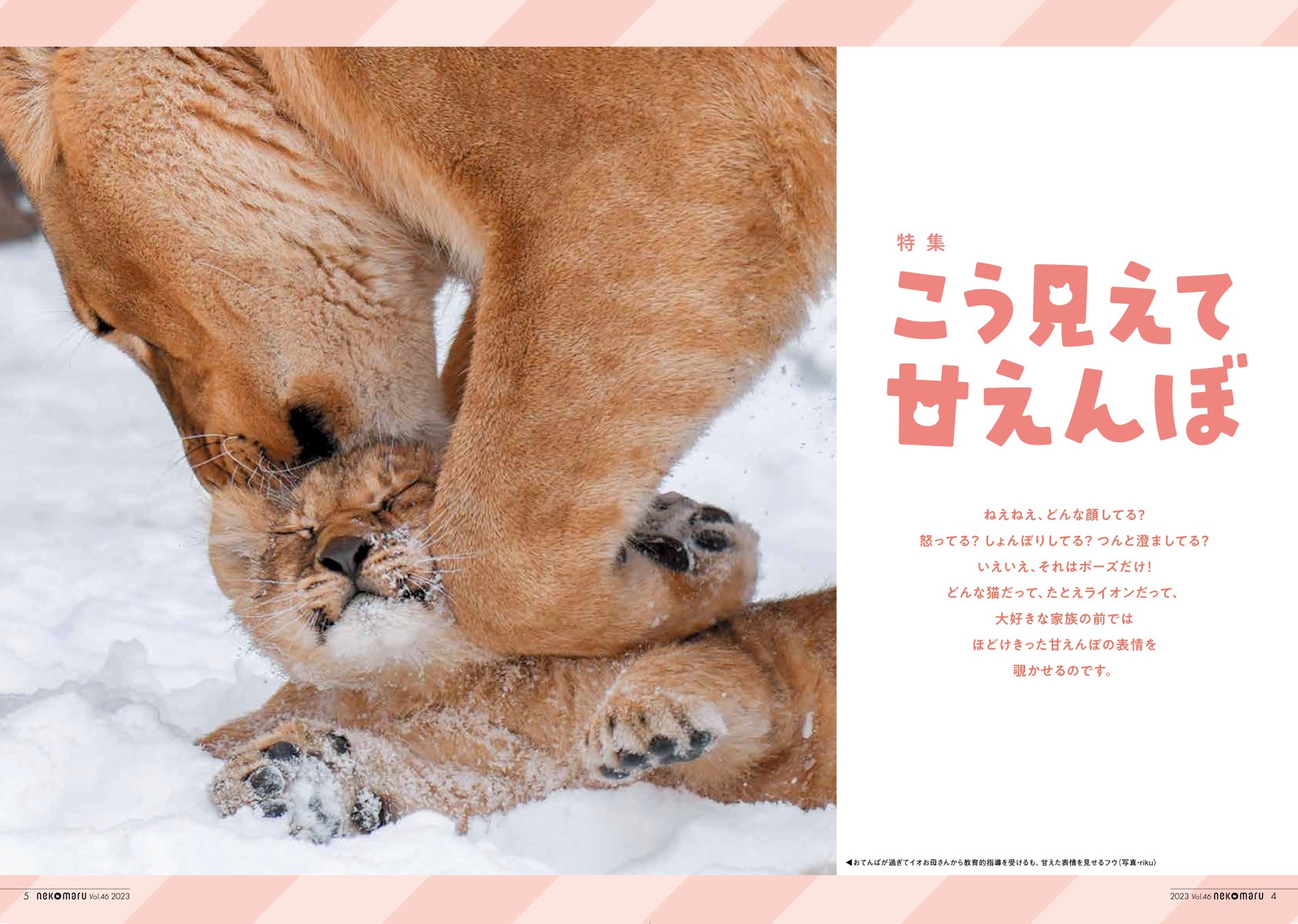 特集「こう見えて甘えんぼ」では、甘えたがりの猫だけでなく、百獣の王・ライオンの甘えん坊3姉妹や、飼い主の方が甘えん坊な悪役レスラーなど、見た目とのギャップがたまらなく愛しい甘えん坊たちがその魅力をたっぷり見せてくれています。