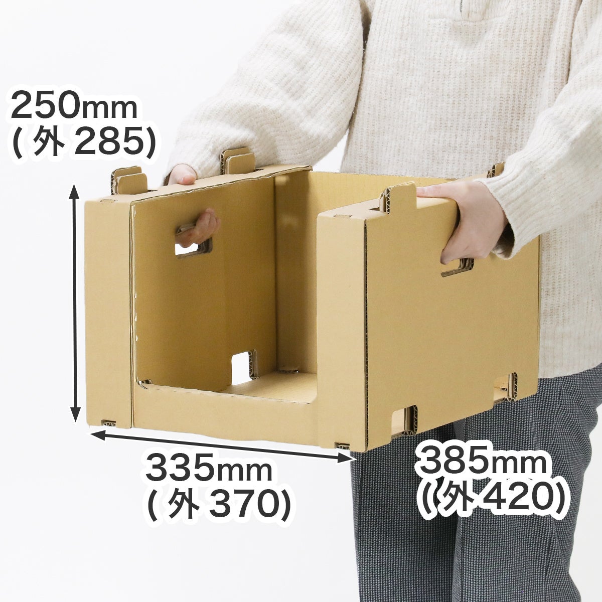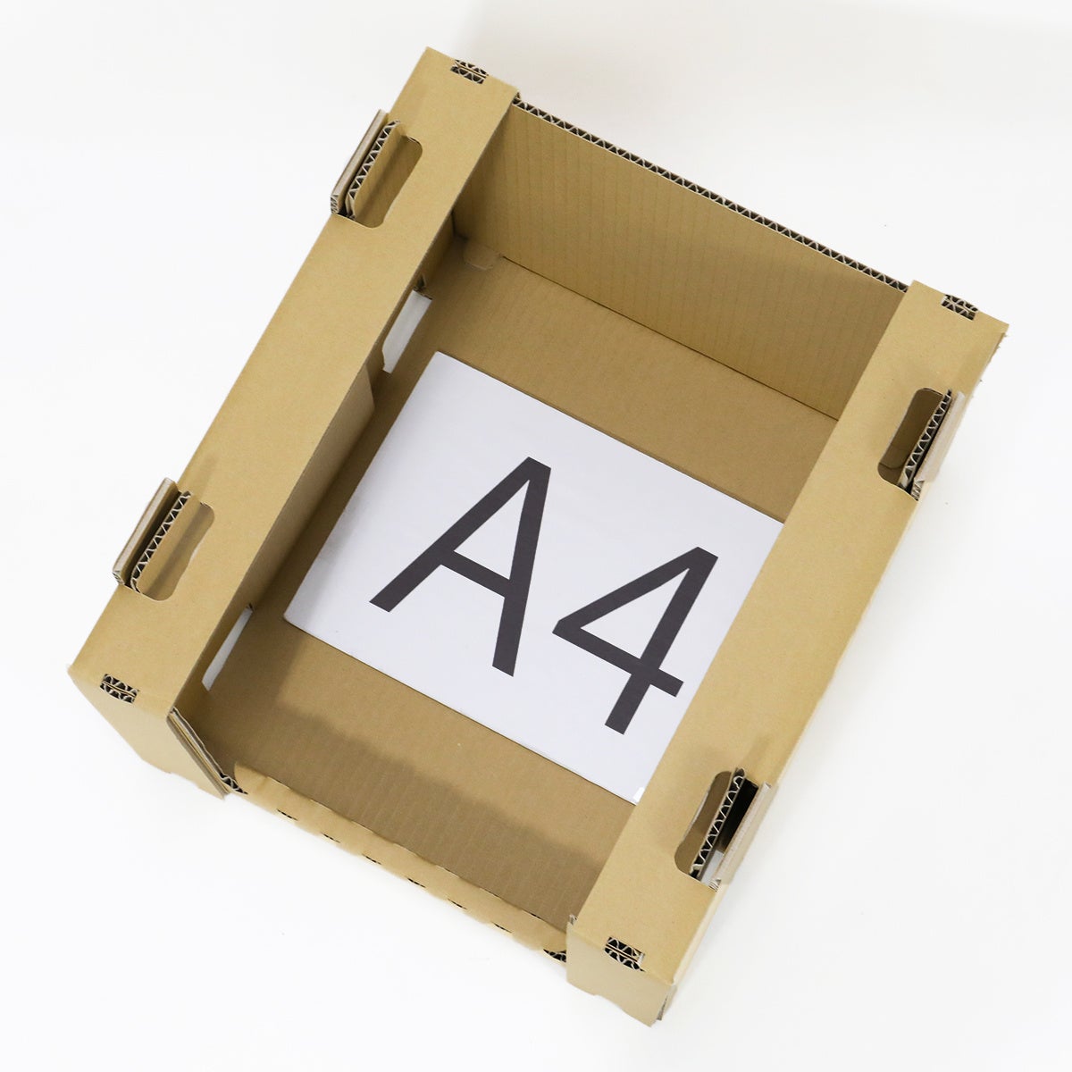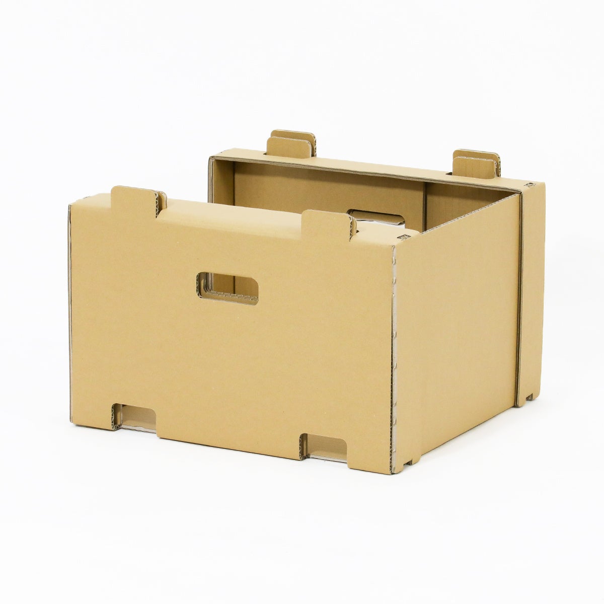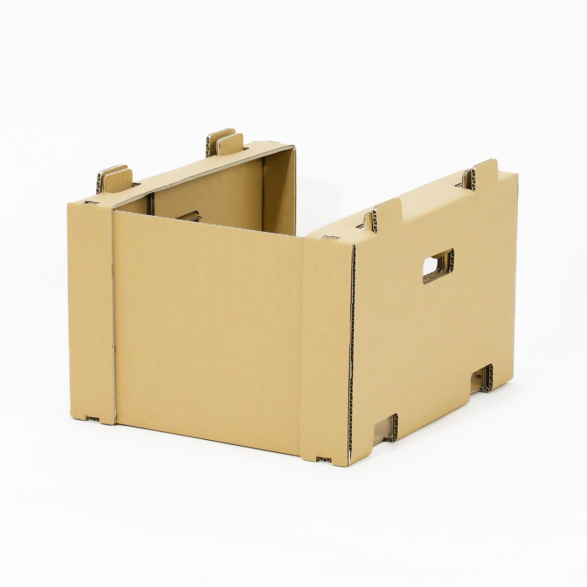 通常のダンボールより強い材質(K6/中芯180g)を採用し、強度を確保しながらも軽量・低コストを実現。解体も簡単に行うことができ、不要になった際は古紙回収に出すことが可能です。