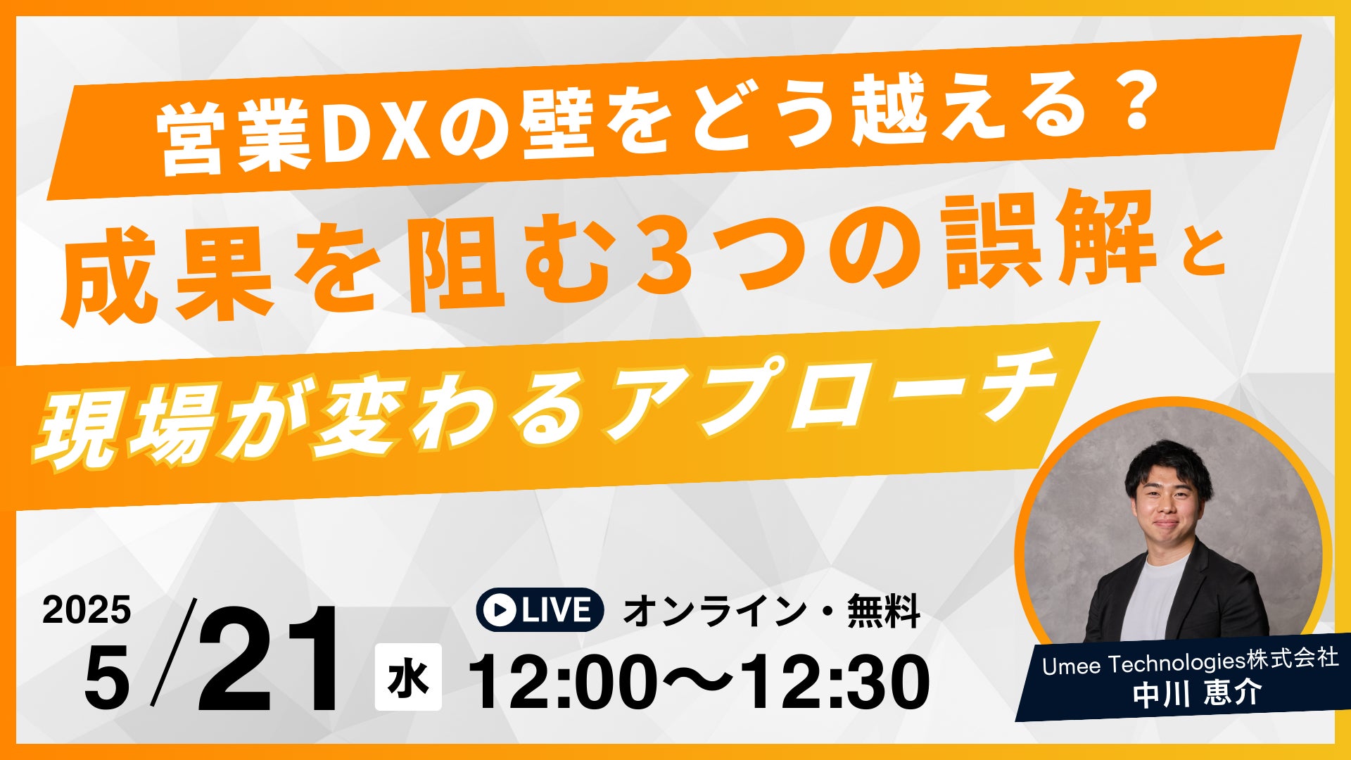 組織に進化をもたらす話術AI「Front Agent」を開発・提供するUmee Technologies株式会社(本社:東京都調布市、代表取締役:新納 弘崇、以下「ユミー」)は、5月21日(水)12:00 - 12:30に無料オンラインセミナー「営業DXの壁をどう越える?成果を阻む3つの誤解と“現場が変わる”アプローチ」を開催いたします。