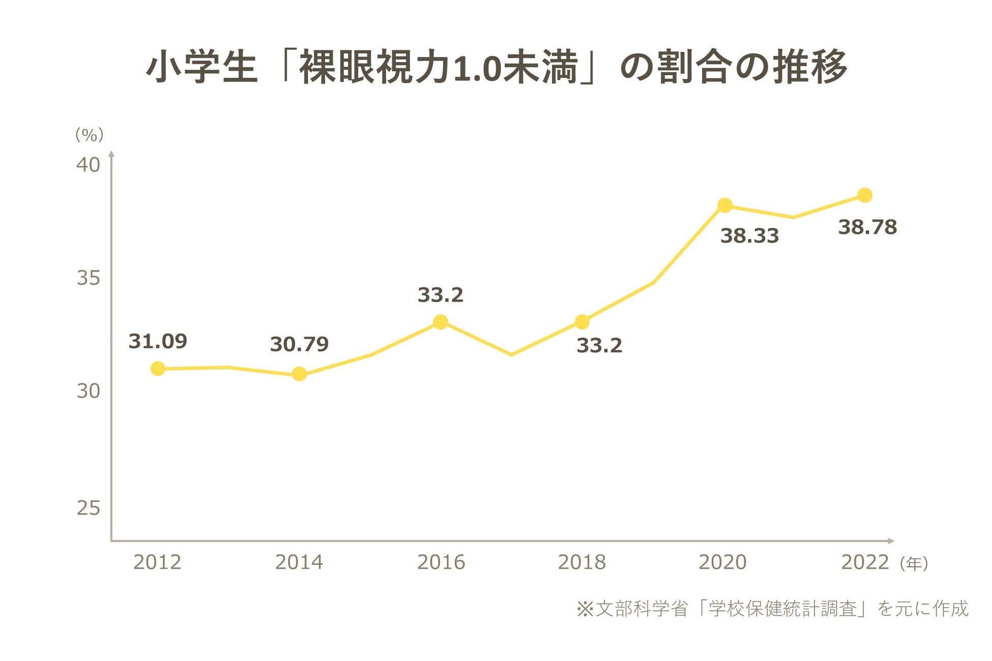 文部科学省の報告によると小学生の「裸眼視力1.0未満」の割合は年々増え続けており、2022年には、3人に1人が裸眼視力1.0未満ということが分かりました。