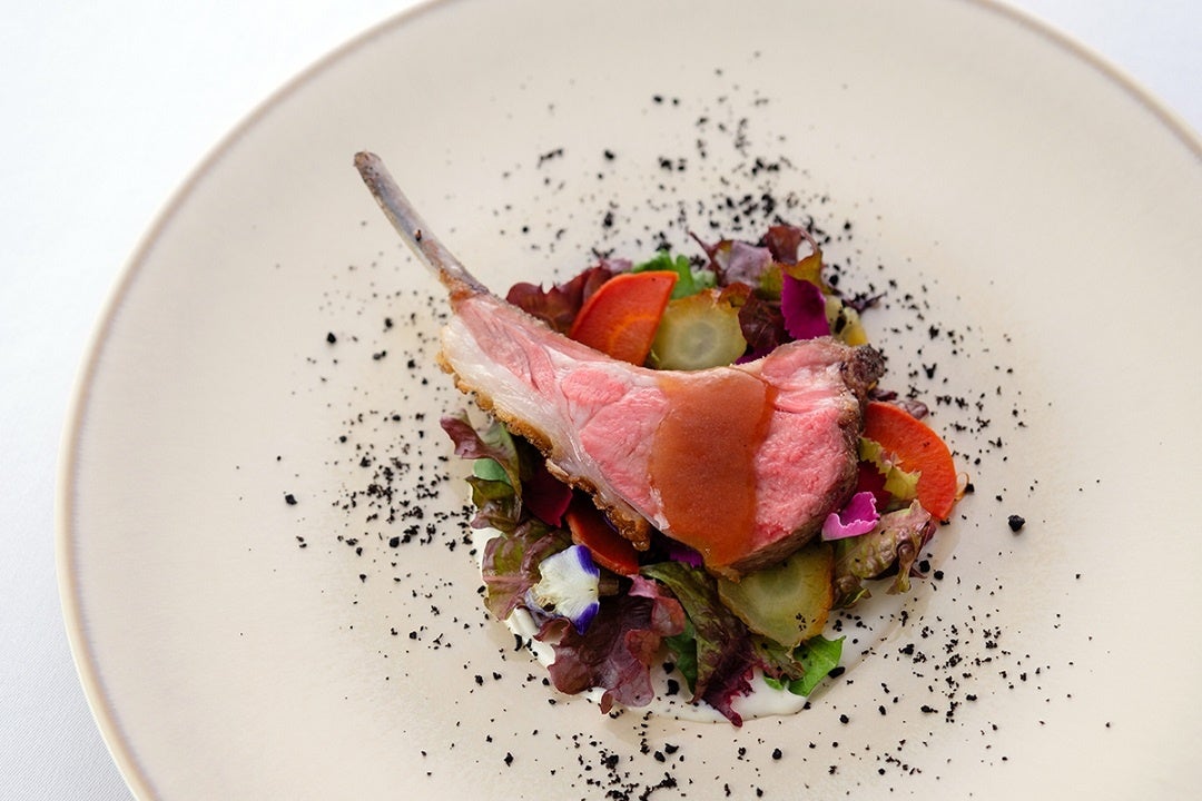 旨みをしっかりと感じるのにクセの少ない、柔らかなアイルランド産の仔羊を鍋の中で香草焼きにした一品。仔羊の下には春の花畑をイメージした色とりどりの野菜を敷き、さらにその下には福岡県大牟田にあるオーム乳業のクリームチーズを使用したソースを合わせました。ジューシーな仔羊とシャキシャキとした野菜の食感の違いもお楽しみください。