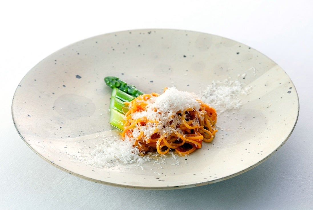 福岡県浮羽で生産される小麦から作ったタリオリーニに、凝縮されたトマトの甘みとほのかな酸味、豚の塩漬けの旨みたっぷりのアマトリチャーナソースを絡めました。一緒に添えた鮮やかな緑色のグリーンアスパラガスが春を感じさせてくれます。