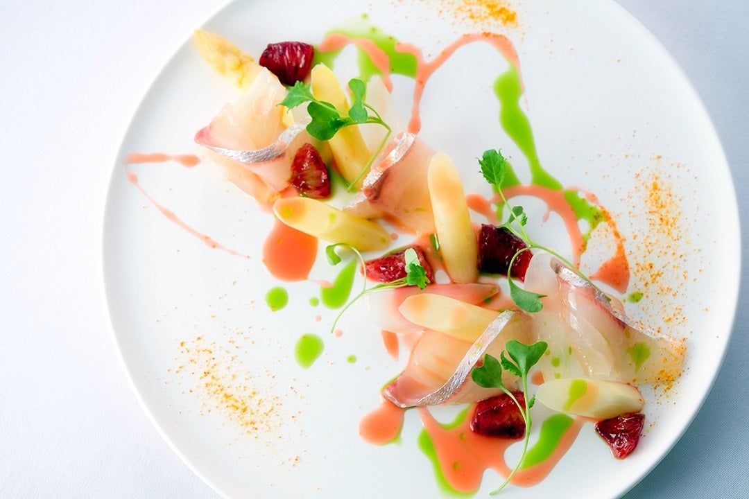春らしい彩りを表現した前菜。活きたままで仕入れた縞鯵は、しめた後に2週間ほど熟成させてからマリネし、佐賀県産の白アスパラガスと能古島のブラッドオレンジを合わせました。熟成により深い旨みが増した縞鯵と白アスパラガスのほのかな甘み、ブラッドオレンジの爽やかさなど、それぞれの食材の良さが引き立ち、食感の違いも楽しめる一皿です。