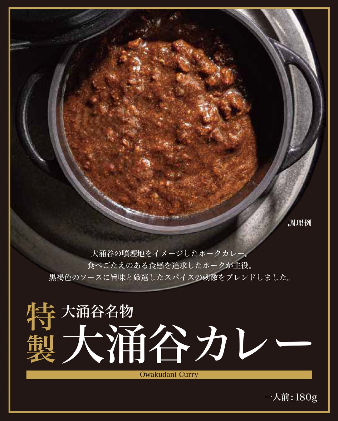 (4)商品説明 「特製」大涌谷カレーは大涌谷の噴煙地をイメージし、黒褐色のソースに旨味と厳選した スパイスをブレンドした食べごたえのあるポークカレーです。