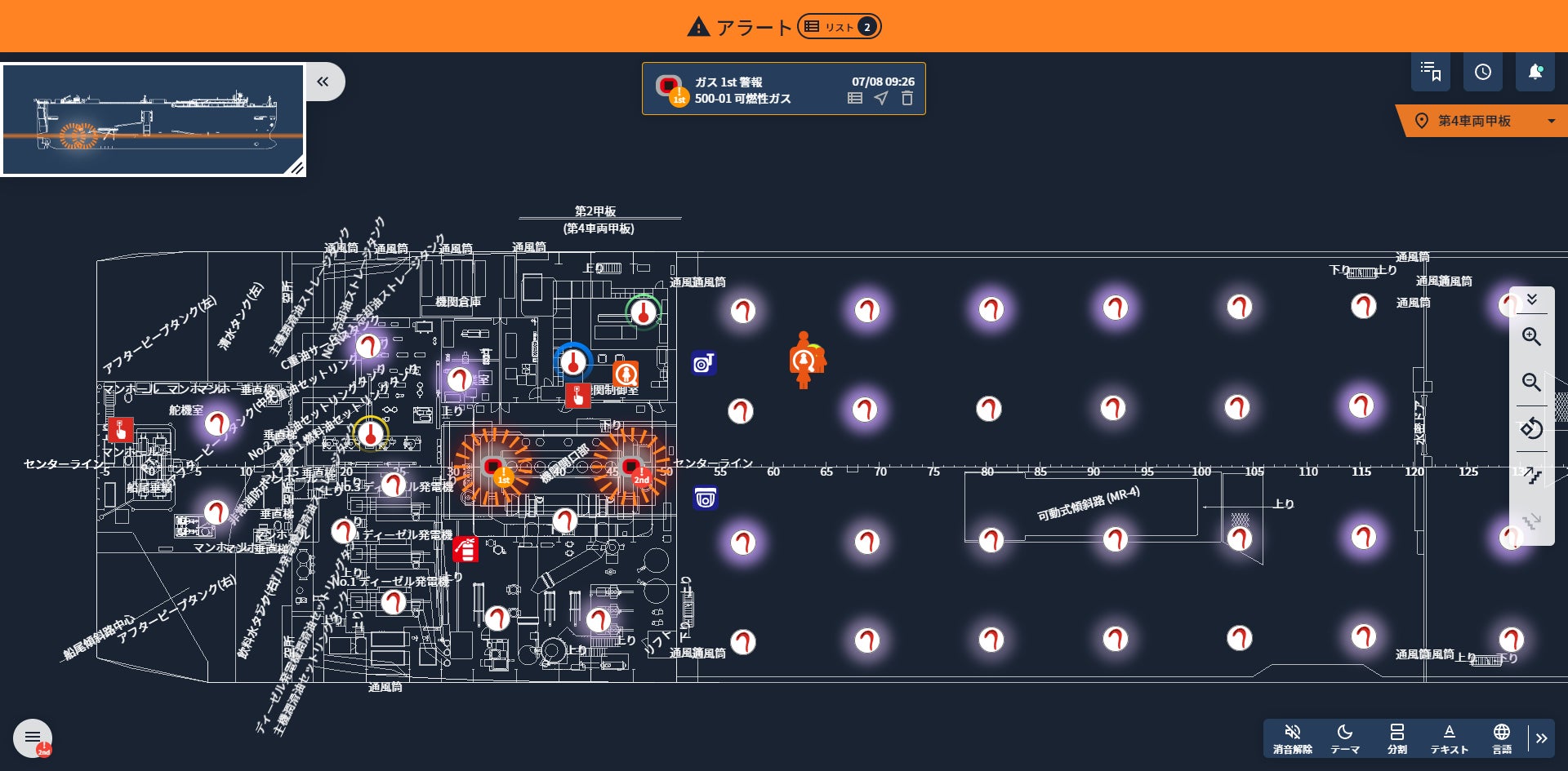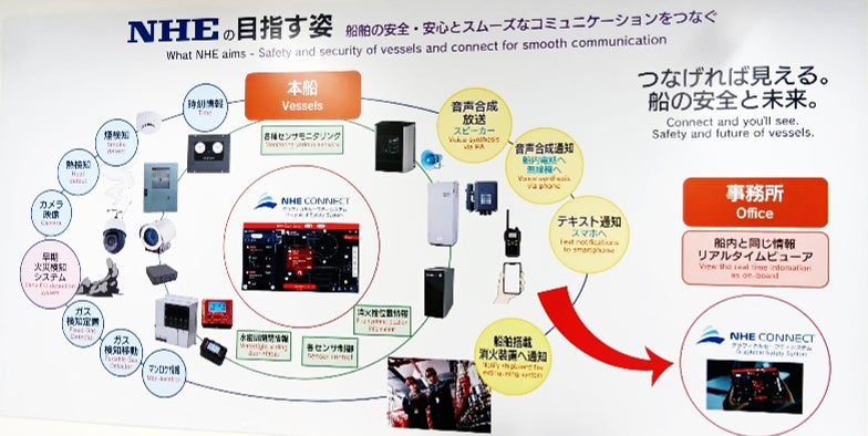 「NHE CONNECT」は、火災探知報知器等の船内の機器と連携し、さまざまな情報をブラウザにて一元表示して情報やインシデントを可視化・周知することができるシステムです。自動車等の輸出入に使われるような大型船舶の場合、火災報知器等の検知機器は1,000点以上設置されているため、こうしたシステムなくしてインシデント発生個所を素早く正確に把握するのは困難です。またリチウムイオン電池・バッテリーを使用した製品の輸出入が盛んになっていることを背景に、輸送船舶の安全運航と火災発生時の対応はますます重要になっています。NHE CONNECTはこのような需要に応え、安全な航海をサポートするものです。