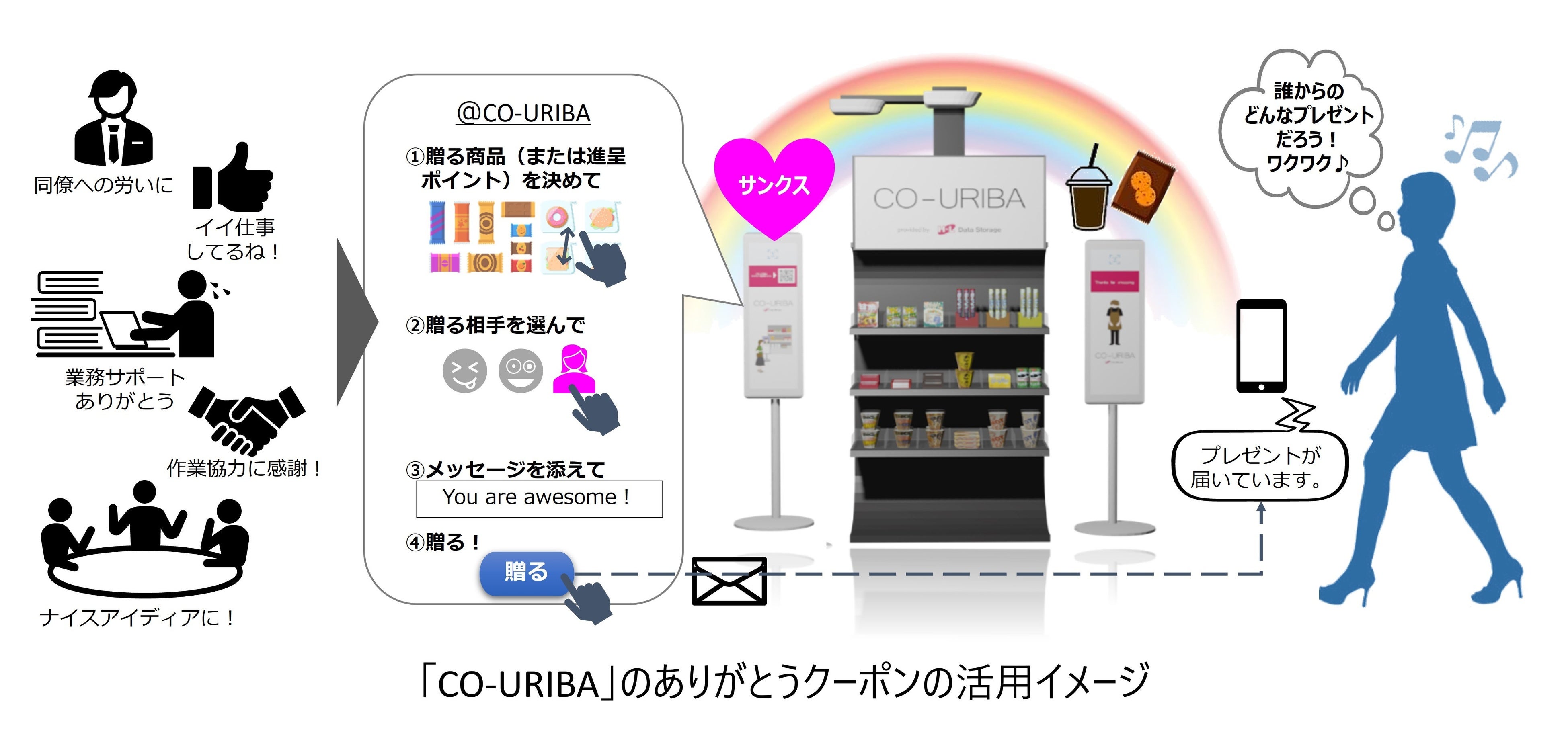 また、ありがとうクーポンは、会社から従業員、同僚から同僚と、感謝の気持ちをクーポンで贈りあうことができる機能です。クーポンは「CO-URIBA」のウェブサイトからいつでもどこからでも贈ることが可能で、他の人に「ありがとうクーポン」を贈ることで、贈った人と貰った人の双方がクーポンを使って「CO-URIBA」で買い物ができます。場所が離れていても気軽に「ありがとう」の気持ちを伝え合うことで、他者とのつながりを感じ、感謝の気持ちを伝えあうことをきっかけとしたコミュニケーション活性化を促進します。
