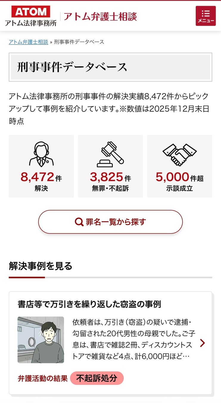 アトム法律グループ(所在地:東京都千代田区、代表:岡野武志)は、刑事事件に特化した専門メディア「アトム弁護士相談」内の『刑事事件の解決事例データベース』をリニューアルしました。