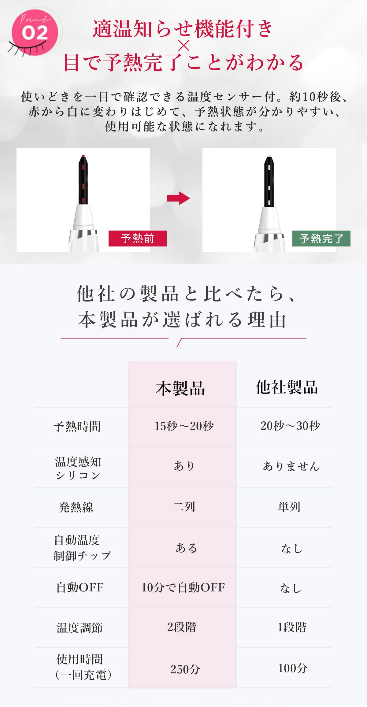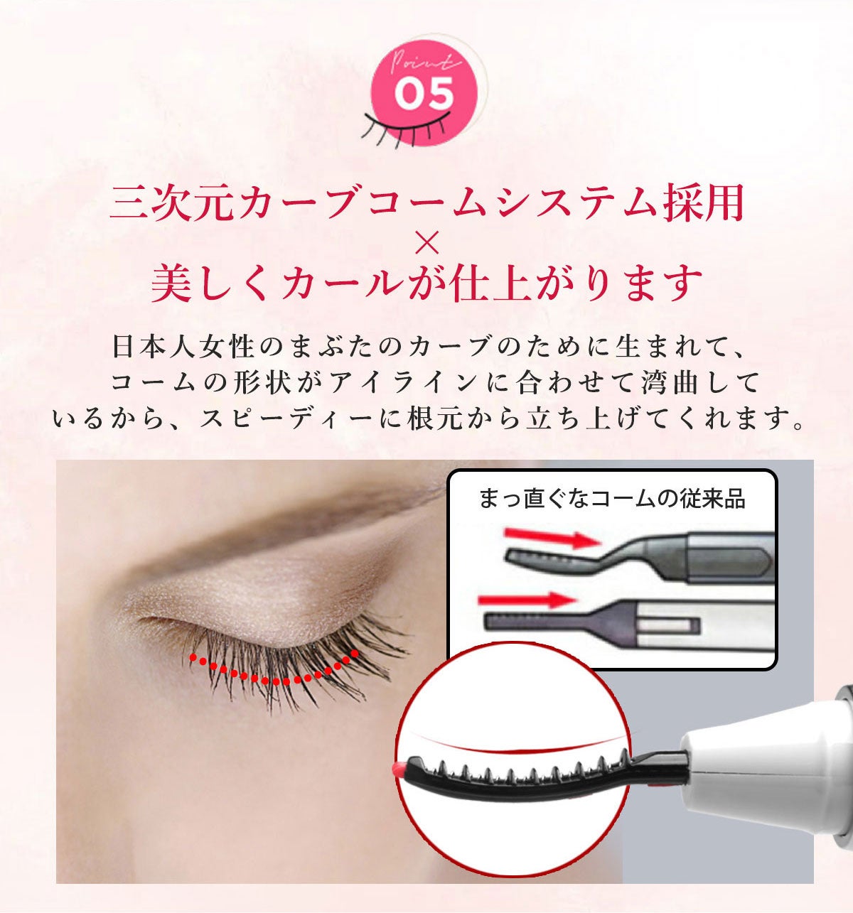 東洋の女性の目型のように、目を開けた時のアイラインにぴったりフィットする弓状カーブコーム採用で、まつげを根元からくっきりカールアップ。まつげの長短、硬さにより、二段階の温度調整機能付き。マスカラとの組み合わせでより美しいカールを作って、まつ毛を巻き上げる効果を生かして自信が溢れる1日になります。