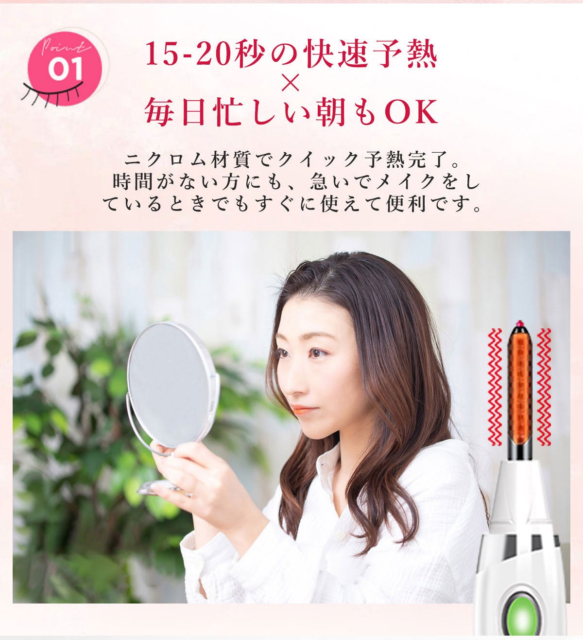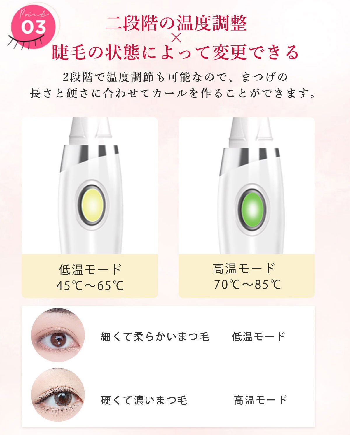 アップグレードした高性能特殊ICチョップを内蔵で最適温度を自動制御。スマートシリコンは、赤が白になると正常に使用できます。コームは凹凸デザインを採用し、0.4cm精確な間隔で発熱線と皮膚に接触しないので、まつげを傷まない、眼瞼の火傷の心配なし。