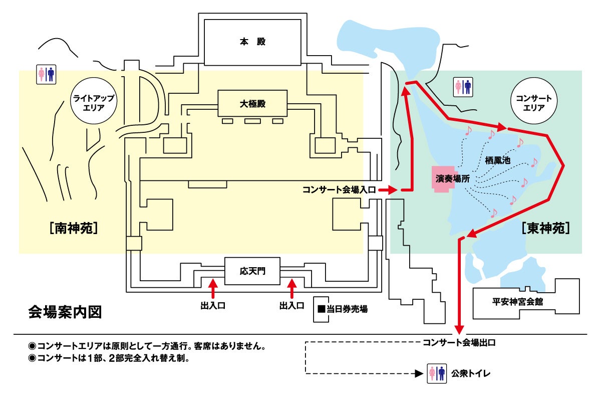 東神苑と南神苑の紅しだれ桜のライトアップと、東神苑貴賓館をステージに演奏される癒やしの音楽をお楽しみいただけます。会場には客席を設けず、ライトアップされた神苑を散策しながら、東神苑・栖鳳池のほとりで、音楽に耳を傾けていただくコンサートです。チケットは、東神苑(コンサート)・南神苑(桜のライトアップ)両方をご鑑賞いただける「コンサート付入場券」、南神苑(桜のライトアップ)のみご鑑賞いただける「入場券」があります。コンサートは入替制によりゆっくりとお楽しみいただけます。
