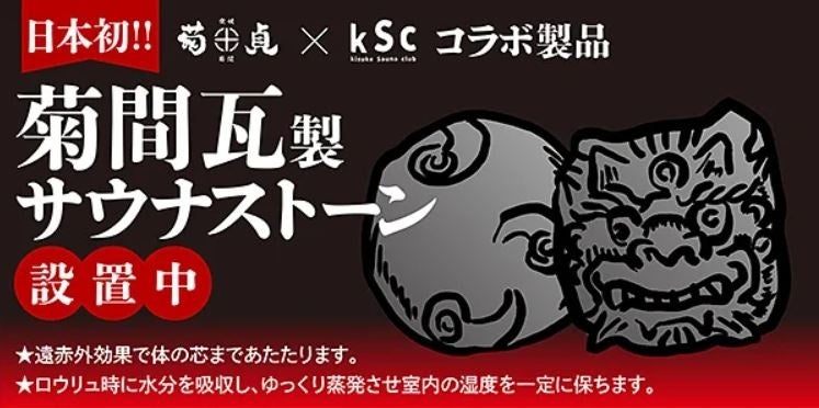 使用するサウナストーンには、愛媛県の伝統工芸である菊間瓦を用いた「鬼丸」と「鬼玉」を採用。菊間瓦製サウナストーンの、鬼瓦デザインの「鬼丸」と勾玉模様の「鬼玉」。一般的なサウナストーンには、耐久性がある、輸入品の橄欖(かんらん)石・輝緑岩(きりょくがん)・人工セラミックが使用されますが、菊間瓦製「鬼丸・鬼玉」は同等の耐熱・耐久性はもちろんのこと、10%以上の吸水率があることで、サウナ室内の乾燥を防ぎ、息苦しさを緩和し、アロマの香りも一般的なサウナストーンより長く保てるメリットがあります。