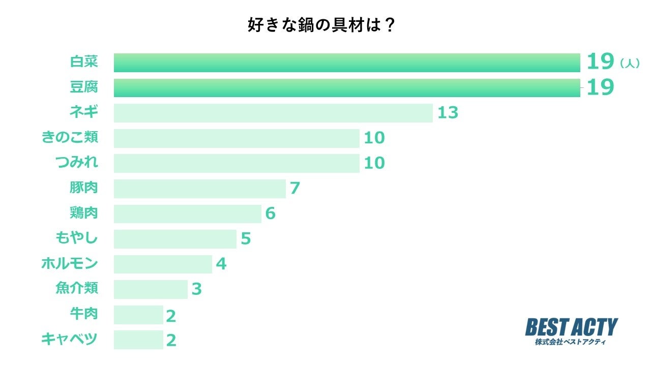 好きな鍋の具材について100人にアンケートを行ったところ、「白菜」と「豆腐」が同率1位となりました。